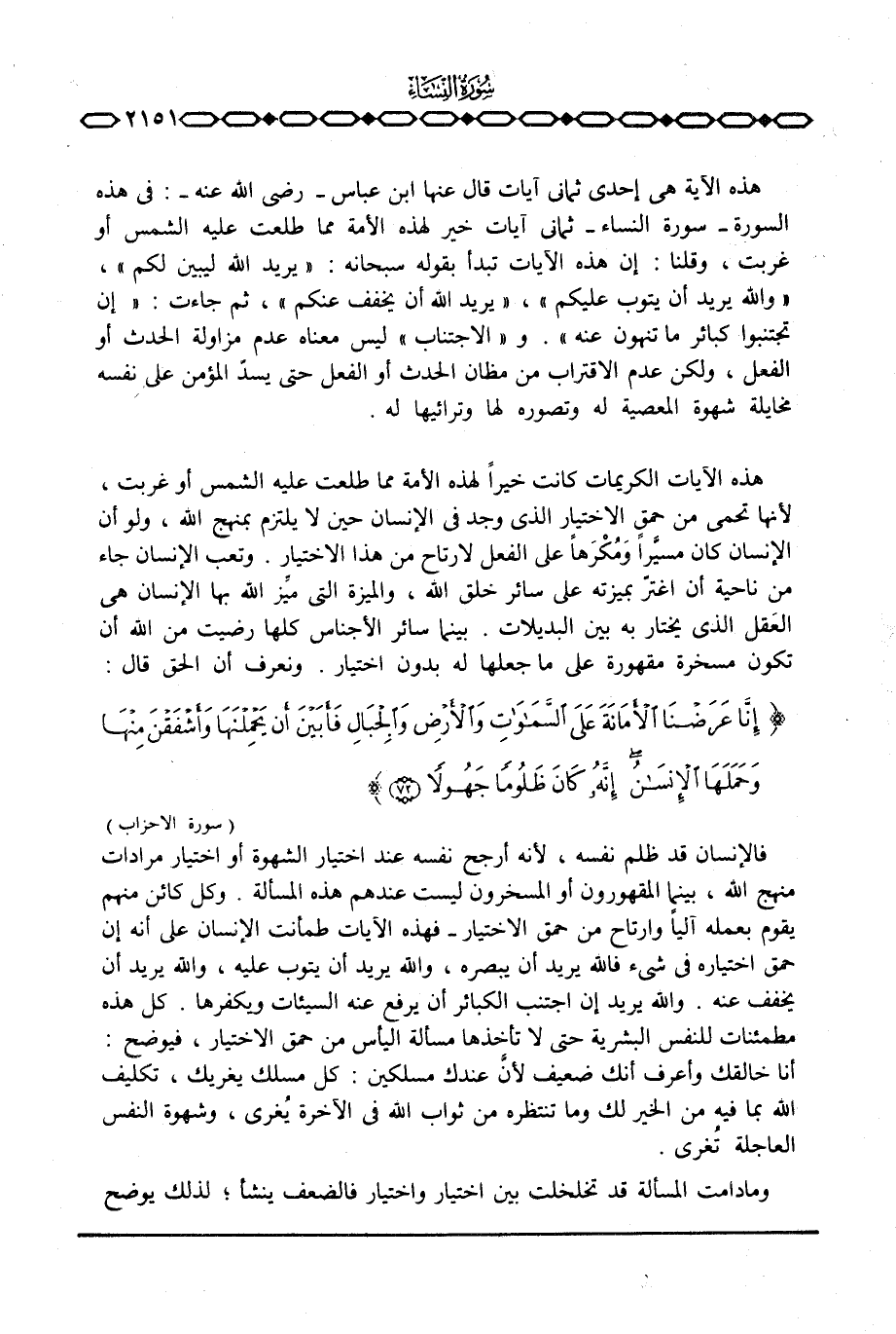 فالإنسان قد ظلم نفسه، لأنه أرجح نفسه عند اختيار الشهوة أو اختيار مرادات منهج الله، بينما المقهورون أو المسخرون ليست عندهم هذه المسألة. وكل كائن منهم يقوم بعمله آلياً وارتاح من حمق الاختيار - فهذه الآيات طمأنت الإنسان على أنه إن حمق اختياره في شيء فالله يريد أن يتوب عليه، والله يريد أن يخفف عنه. والله يريد إن اجتنب الكبائر أن يرفع عنه السيئات ويكفرها. كل هذه مطمئنات للنفس البشرية حتى لا تأخذها مسألة اليأس من حمق الاختيار، فيوضح: أنا خالقك وأعرف أنك ضعيف لأنَّ عندك مسلكين: كل مسلك يغريك، تكليف الله بما فيه من الخير لك وما تنتظره من ثواب الله في الآخرة يُغري، وشهوة النفس العاجلة تُغري.