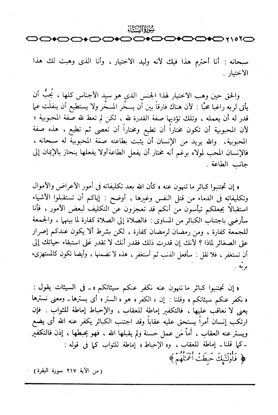 {إِن تَجْتَنِبُواْ كَبَآئِرَ مَا تُنْهَوْنَ عَنْهُ} كأن الله بعد تكليفاته في أمور الأعراض والأموال وتكليفاته في الدماء من قتل النفس وغيرها، أوضح: إياكم أن تستقبلوا الأشياء استقبالاً يجعلكم تيأسون من أنكم قد تعجزون عن التكليف لبعض الأمور، فأنا سأرضى باجتناب الكبائر من المساوي: فالصلاة إلى الصلاة كفارة لما بينهما، والجمعة للجمعة كفارة، ومن رمضان لرمضان كفارة، لكن بشرط ألا يكون عندكم إصرار على الصغائر لماذا؟ لأنك إن قدرت ذلك فقدر أنك لا تقدر على استبقاء حياتك إلى أن تستغفر، فلا تقل: سأفعل الذنب ثم أستغفر، هذه لا تضمنها، وأيضا تكون كالمستهزئ بربّه.