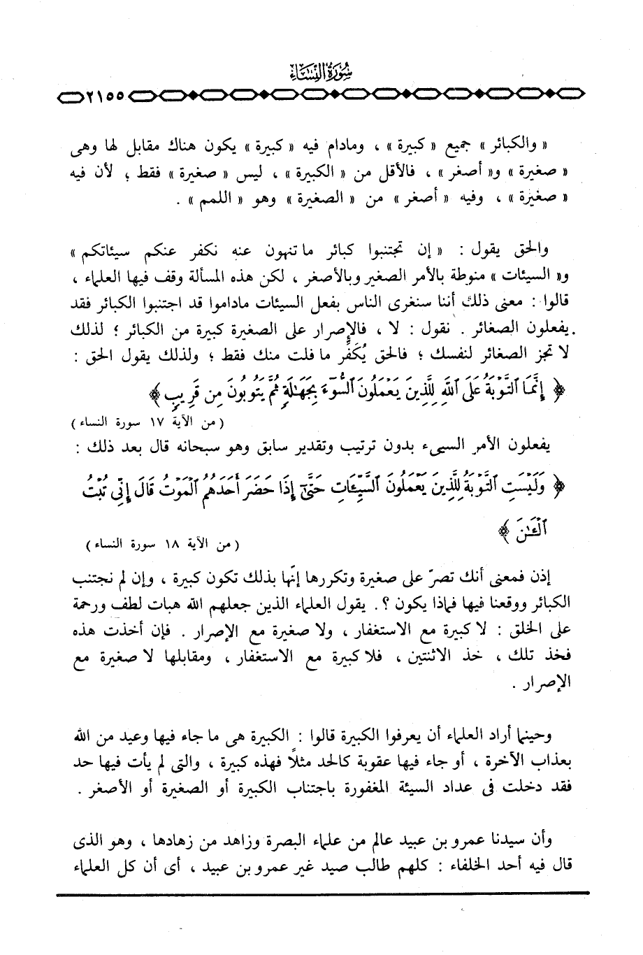 والحق يقول: {إِن تَجْتَنِبُواْ كَبَآئِرَ مَا تُنْهَوْنَ عَنْهُ نُكَفِّرْ عَنْكُمْ سَيِّئَاتِكُمْ} و «السيئات» منوطة بالأمر الصغير وبالأصغر، لكن هذه المسألة وقف فيها العلماء، قالوا: معنى ذلك أننا سنغري الناس بفعل السيئات ما داموا قد اجتنبوا الكبائر فقد يفعلون الصغائر. نقول: لا، فالإصرار على الصغيرة كبيرة من الكبائر؛ لذلك لا تجز الصغائر لنفسك؛ فالحق يُكَفّر ما فلت منك فقط؛ ولذلك يقول الحق: {إِنَّمَا التوبة عَلَى الله لِلَّذِينَ يَعْمَلُونَ السواء بِجَهَالَةٍ ثُمَّ يَتُوبُونَ مِن قَرِيبٍ} [النساء: 17] .