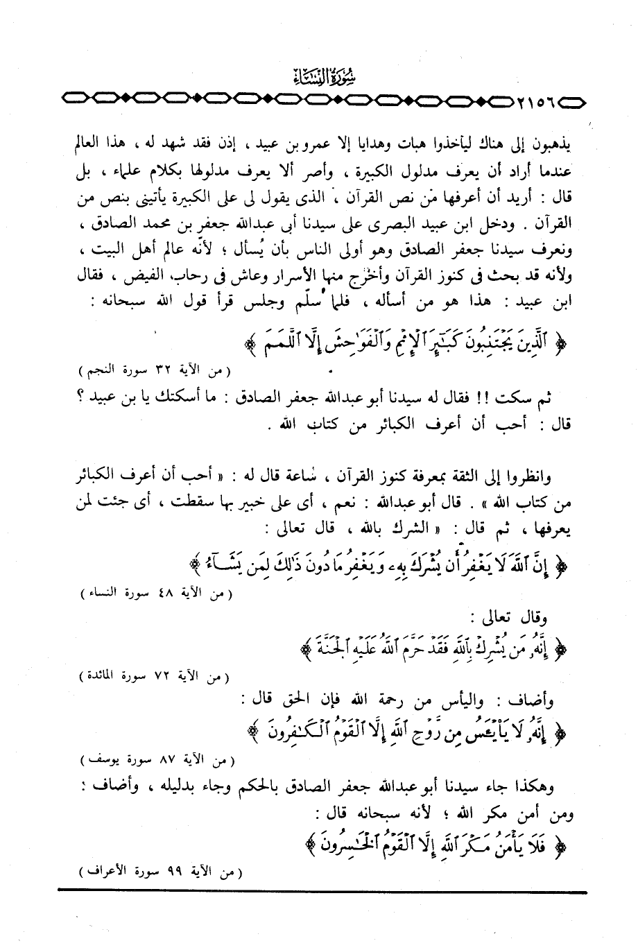 ثم سكت!! فقال له سيدنا أبو عبد الله جعفر الصادق: ما أسكتك يا بن عبيد؟ قال: أحب أن أعرف الكبائر من كتاب الله.
