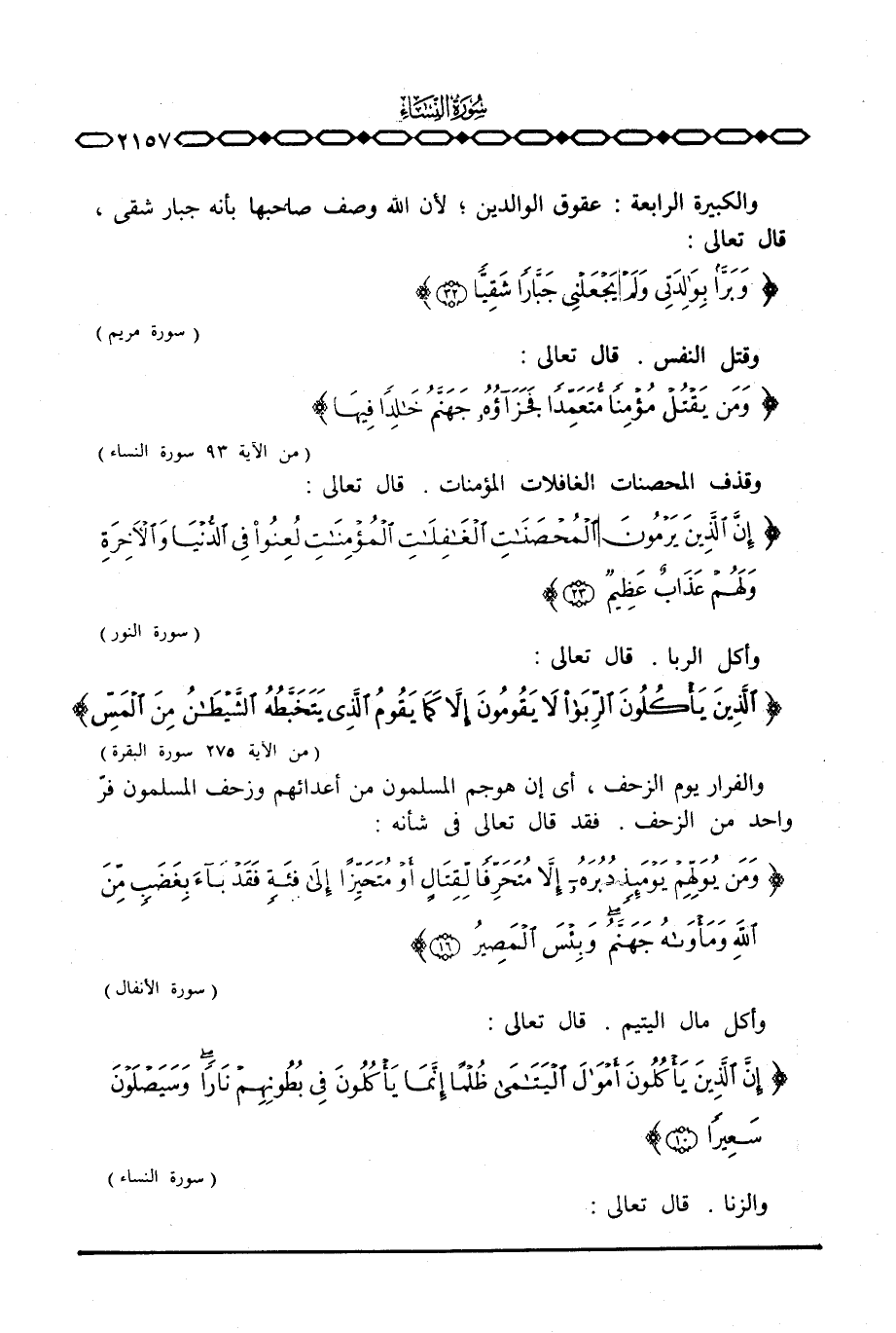وقتل النفس. قال تعالى: {وَمَن يَقْتُلْ مُؤْمِناً مُّتَعَمِّداً فَجَزَآؤُهُ جَهَنَّمُ خَالِداً فِيهَا} [النساء: 93] .