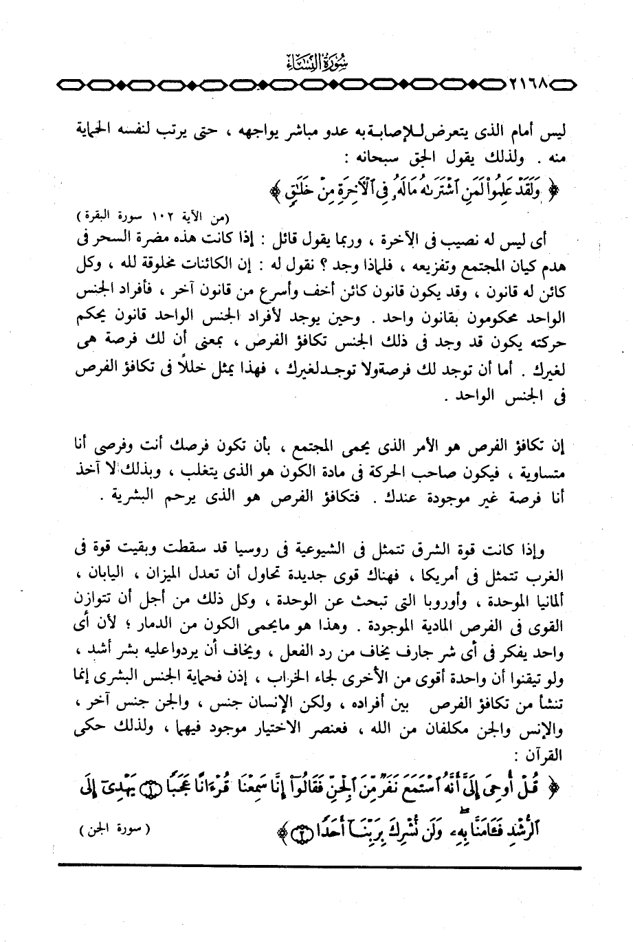 وإذا كانت قوة الشرق تتمثل في الشيوعية في روسيا قد سقطت وبقيت قوة في الغرب تتمثل في أمريكا، فهناك قوي جديدة تحاول أن تعدل الميزان، اليابان، ألمانيا الموحدة، وأوروبا التي تبحث عن الوحدة، وكل ذلك من أجل أن تتوازن القوي في الفرص المادية الموجودة. وهذا هو ما يحمي الكون من الدمار؛ لأن أي واحد يفكر في أي شر جارف يخاف من رد الفعل، ويخاف أن يردوا عليه بشر أشد، ولو تيقنوا أن واحدة أقوي من الأخرى لجاء الخراب، إذن فحماية الجنس البشري إنما تنشأ من تكافؤ الفرص بين أفراده، ولكن الإنسان جنس، والجن جنس آخر، والإنس والجن مكلفان من الله، فعنصر الاختيار موجود فيهما، ولذلك حكي القرآن: