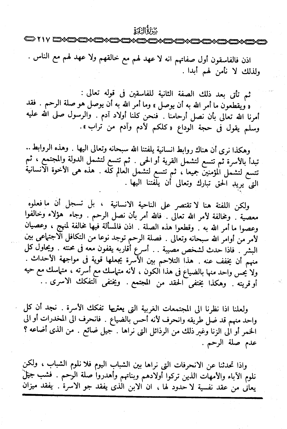 ولكن اللفتة هنا لا تقتصر على الناحية الإنسانية، بل تسجل أن ما فعلوا معصية، ومخالفة لأمر الله تعالى. فالله أمر بأن نصل الرحم. وجاء هؤلاء وخالفوا وعصوا ما أمر الله به. وقطعوا هذه الصلة. إذن فالمسألة فيها مخالفة لمنهج، وعصيان لأمر من أوامر الله سبحانه وتعالى. فصلة الرحم توجد نوعا من التكافل الاجتماعي بين البشر. فإذا حدث لشخص مصيبة. . أسرع أقاربه يقفون معه في محنته. ويحاول كل منهم أن يخفف عنه. هذا التلاحم بين الأسرة يجعلها قوية في مواجهة الأحداث. ولا يحس واحد منها بالضياع في هذا الكون، لأنه متماسك مع أسرته، متماسك مع حيه أو قريته. هكذا يختفي الحقد من المجتمع. ويختفي التفكك الأسري. .