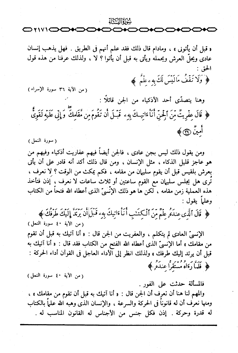 الإنسيّ العادي لم يتكلم، والعفريت من الجن قال: {أَنَاْ آتِيكَ بِهِ قَبْلَ أَن تَقُومَ مِن مَّقَامِكَ} أما الإنسيّ الذي أعطاه الله الفتح من الكتاب فقد قال: {أَنَاْ آتِيكَ بِهِ قَبْلَ أَن يَرْتَدَّ إِلَيْكَ طَرْفُكَ} ولذلك انظر إلى الأداء العاجل في القرآن أداء الحركة: {فَلَمَّا رَآهُ مُسْتَقِرّاً عِندَهُ} [النمل: 40] .