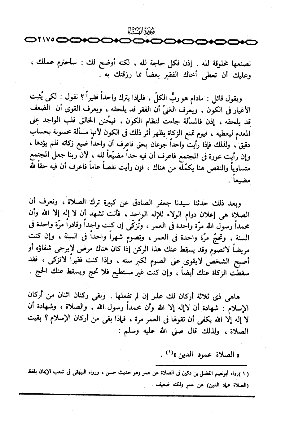 وبعد ذلك حدثنا سيدنا جعفر الصادق عن كبيرة ترك الصلاة، ونعرف أن الصلاة هي إعلان دوام الولاء للإله الواحد، فأنت تشهد أن لا إله إلا الله وأن محمداً رسول الله مرّة واحدة في العمر، وتُزكيّ إن كنت واجداً وقادراً مرّة واحدة في السنة، وتحجُ مرّة واحدة في العمر، وتصوم شهراً واحداً في السنة، وإن كنت مريضاً لا تصوم وقد يسقط عنك هذا الركن إذا كان هناك مرض لا يرجى شفاؤه أو أصبح الشخص لا يقوى على الصوم لكبر سنه، وإذا كنت فقيراً لا تزكي، فقد سقطت الزكاة عنك أيضاً، وإن كنت غير مستطيع فلا تحج ويسقط عنك الحج.