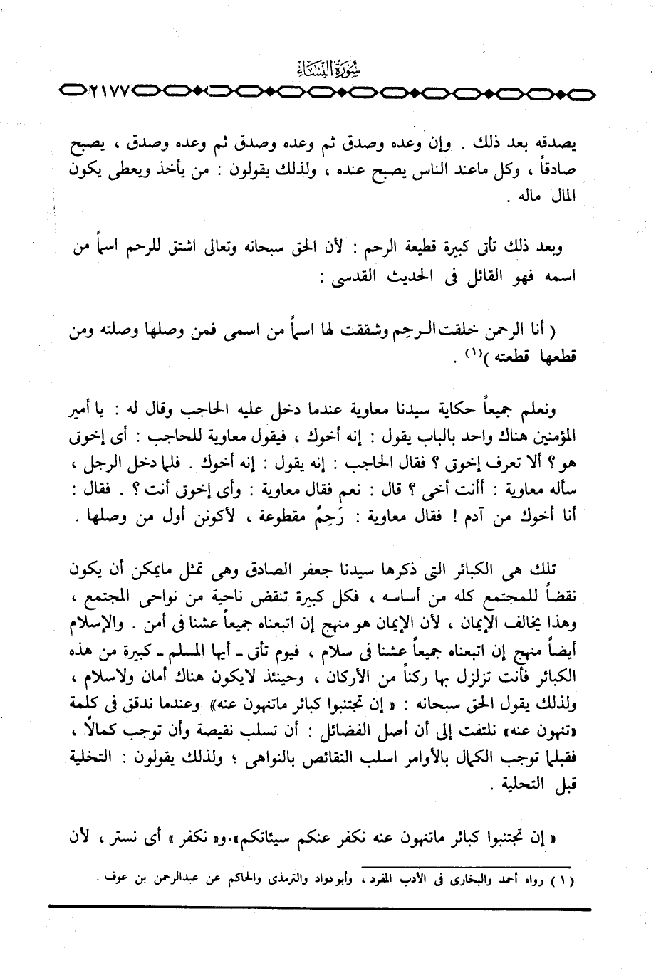 تلك هي الكبائر التي ذكرها سيدنا جعفر الصادق وهي تمثل ما يمكن أن يكون نقضاً للمجتمع كله من أساسه، فكل كبيرة تنقض ناحية من نواحي المجتمع، وهذا يخالف الإيمان، لأن الإيمان هو منهج إن اتبعناه جميعاً عشنا في أمن. والإسلام أيضاً منهج إن اتبعناه جميعاً عشنا في سلام، فيوم تأتي - أيها المسلم - كبيرة من هذه الكبائر فأنت تزلزل بها ركناً من الأركان، وحينئذ لا يكون هناك أمان ولا سلام، ولذلك يقول الحق سبحانه: {إِن تَجْتَنِبُواْ كَبَآئِرَ مَا تُنْهَوْنَ عَنْهُ} وعندما ندقق في كلمة {تُنْهَوْنَ عَنْهُ} نلتفت إلى أن أصل الفضائل: أن تسلب نقيصة وأن توجب كمالاً، فقبلما توجب الكمال بالأوامر اسلب النقائص بالنواهي؛ ولذلك يقولون: التخلية قبل التحلية.