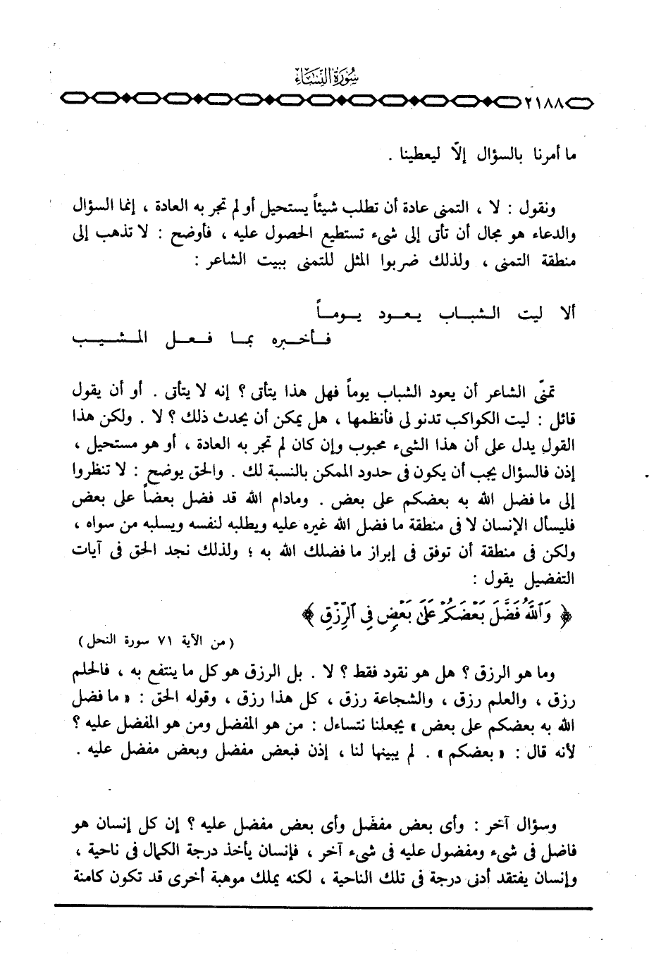 تمنىّ الشاعر أن يعود الشباب يوماً فهل هذا يتأتى؟ إنه لا يتأتى. أو أن يقول قائل: ليت الكواكب تدنو لي فأنظمها، هل يمكن أن يحدث ذلك؟ لا. ولكن هذا القول يدل على أن هذا الشيء محبوب وإن كان لم تجر به العادة، أو هو مستحيل، إذن فالسؤال يجب أن يكون في حدود الممكن بالنسبة لك. والحق يوضح: لا تنظروا إلى ما فضل الله به بعضكم على بعض. وما دام الله قد فضل بعضاً على بعض فليسأل الإنسان لا في منطقة ما فضل الله غيره عليه ويطلبه لنفسه ويسلبه من سواه، ولكن في منطقة أن توفق في إبراز ما فضلك الله به؛ ولذلك نجد الحق في آيات التفضيل يقول: