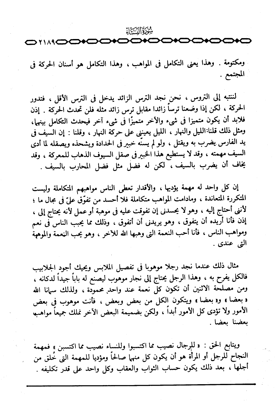 ويتابع الحق: {لِّلرِّجَالِ نَصِيبٌ مِّمَّا اكتسبوا وَلِلنِّسَآءِ نَصِيبٌ مِّمَّا اكتسبن} فمهمة النجاح للرجل أو المرأة هو أن يكون كل منهما صالحاً ومؤديا للمهمة التي خُلق من أجلها، بعد ذلك يكون حساب الثواب والعقاب وكل واحد على قدر تكليفه.