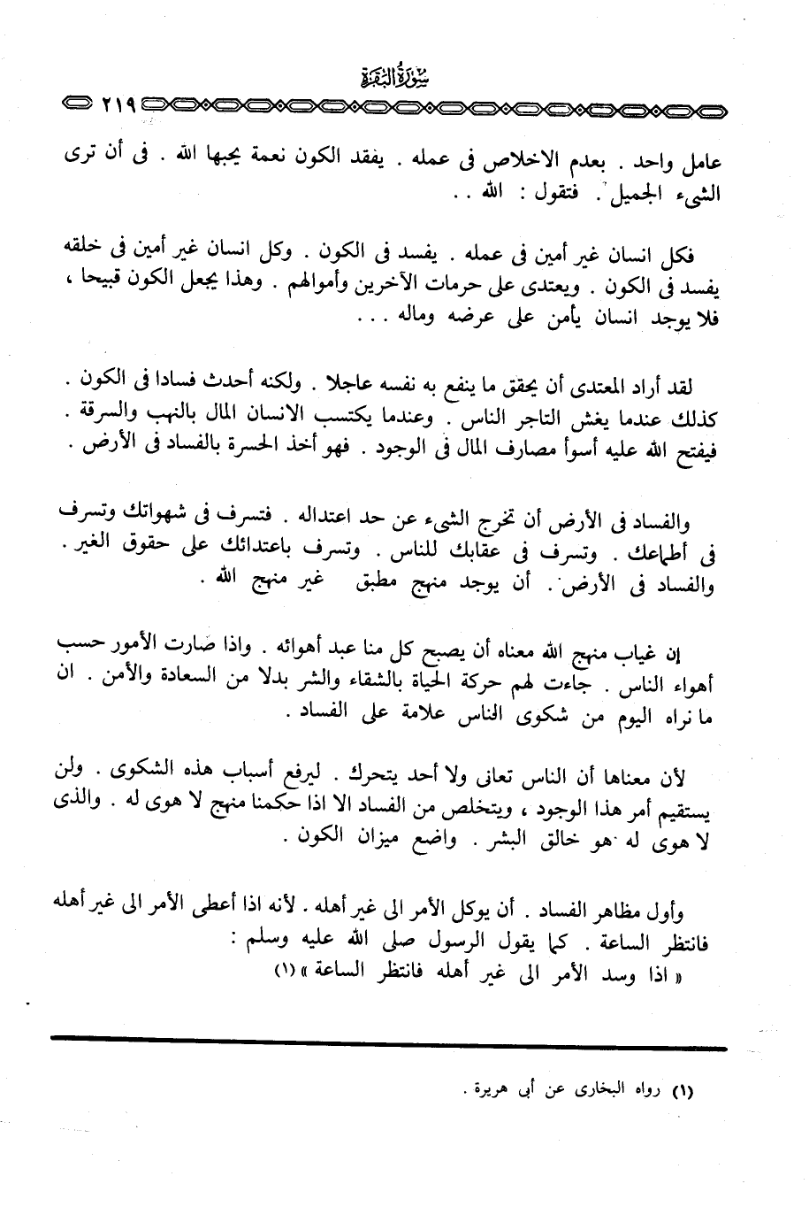 وأول مظاهر الفساد. أن يوكل الأمر إلى غير أهله. لأنه إذا أعطى الأمر إلى غير أهله فانتظر الساعة. كما يقول الرسول صَلَّى اللَّهُ عَلَيْهِ وَسَلَّم َ: «إذا وسد الأمر إلى غير أهله فانتظر الساعة» .
