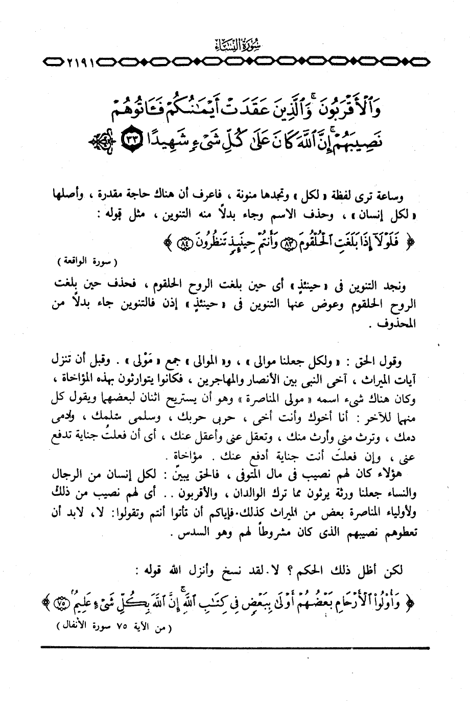 هؤلاء كان لهم نصيب في مال المتوفي، فالحق يبيّن: لكل إنسان من الرجال والنساء جعلنا ورثة يرثون مما ترك الوالدان، والأقربون. . أي لهم نصيب من ذلك ولأولياء المناصرة بعض من الميراث كذلك. فإياكم أن تأتوا أنتم وتقولوا: لا، لا بد أن تعطوهم نصيبهم الذي كان مشروطاً لهم وهو السدس.