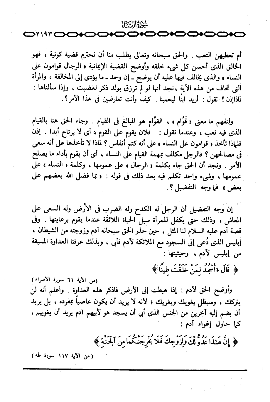 إن وجه التفضيل أن الرجل له الكدح وله الضرب في الأرض وله السعي على المعاش، وذلك حتى يكفل للمرأة سبل الحياة اللائقة عندما يقوم برعايتها. وفي قصة آدم عليه السلام لنا المثل، حين حذر الحق سبحانه آدم وزوجته من الشيطان، إبليس الذي دُعي إلى السجود مع الملائكة لآدم فأبى، وبذلك عرفنا العداوة المسبقة من إبليس لآدم، وحيثيتها: {قَالَ أَأَسْجُدُ لِمَنْ خَلَقْتَ طِيناً} [الإسراء: 61] .
