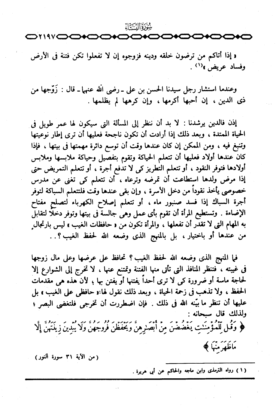 إذن فالدين يرشدنا: لا بد أن ننظر إلى المسألة التي سيكون لها عمر طويل في الحياة الممتدة، وبعد ذلك إذا أرادت أن تكون ناجحه فعليها أن ترى إطار نوعيتها وتنبغ فيه، ومن الممكن إن كان عندها وقت أن توسع دائرة مهمتها في بيتها، فإذا كان عندها أولاد فعليها أن تتعلم الحياكة وتقوم بتفصيل وحياكة ملابسها وملابس أولادها فتوفر النقود، أو تتعلم التطريز كي لا تدفع أجرة، أو تتعلم التمريض حتى إذا مرض ولدها استطاعت أن تمرضه وترعاه، أن تتعلم كي تغني عن مدرس خصوصي يأخذ نقوداً من دخل الأسرة، وإن بقي عندها وقت فلتتعلم السباكة لتوفر أجرة السباك إذا فسد صنبور ماء، أو تتعلم إصلاح الكهرباء لتصلح مفتاح الإضاءة.