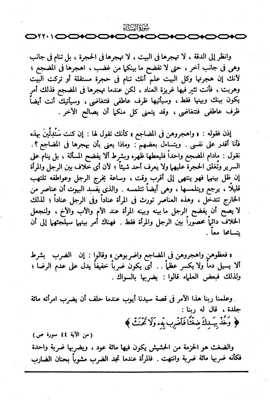 {فَعِظُوهُنَّ واهجروهن فِي المضاجع واضربوهن} وقالوا: إن الضرب بشرط ألا يسيل دما ولا يكسر عظما. . أي يكون ضرباً خفيفاً يدل على عدم الرضا؛ ولذلك فبعض العلماء قالوا: يضربها بالسواك.