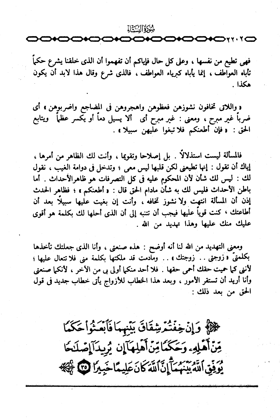 ومعنى التهديد من الله لنا أنه أوضح: هذه صنعتي، وأنا الذي جعلتك تأخذها بكلمتيّ» زوجني. . زوجتك «. . وما دمت قد ملكتها بكلمة مني فلا تتعال عليها؛ لأنني كما حميت حقك أحمى حقها. فلا أحد منكما أولى بي من الآخر، لأنكما صنعتي وأنا أريد أن تستقر الأمور، وبعد هذا الخطاب للأزواج يأتي خطاب جديد في قول الحق من بعد ذلك: {وَإِنْ خِفْتُمْ شِقَاقَ بَيْنِهِمَا فابعثوا ... } .