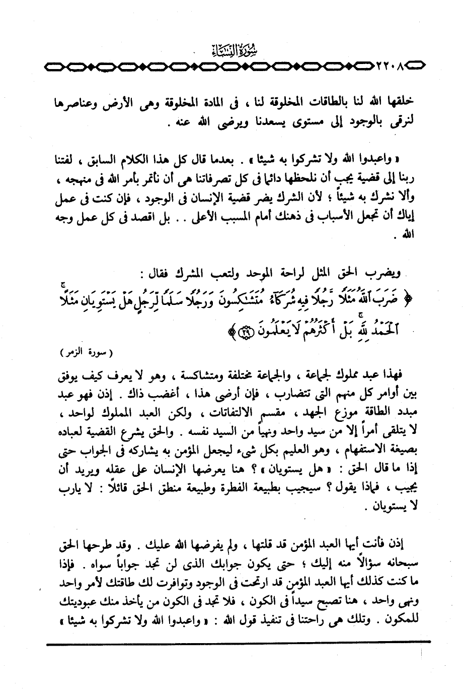 فهذا عبد مملوك لجماعة، والجماعة مختلفة ومتشاكسة، وهو لا يعرف كيف يوفق بين أوامر كل منهم التي تتضارب، فإن أرضي هذا، أغضب ذاك. إذن فهو عبد مبدد الطاقة موزع الجهد، مقسم الالتفاتات، ولكن العبد المملوك لواحد، لا يتلقى أمراً إلا من سيد واحد ونهياً من السيد نفسه. والحق يشرع القضية لعباده بصيغة الاستفهام، وهو العليم بكل شيء ليجعل المؤمن به يشاركه في الجواب حتى إذا ما قال الحق: «هل يستويان» ؟ هنا يعرضها الإنسان على عقله ويريد أن يجيب، فماذا يقول؟ سيجيب بطبيعة الفطرة وطبيعة منطق الحق قائلاً: لا يا رب لا يستويان.
