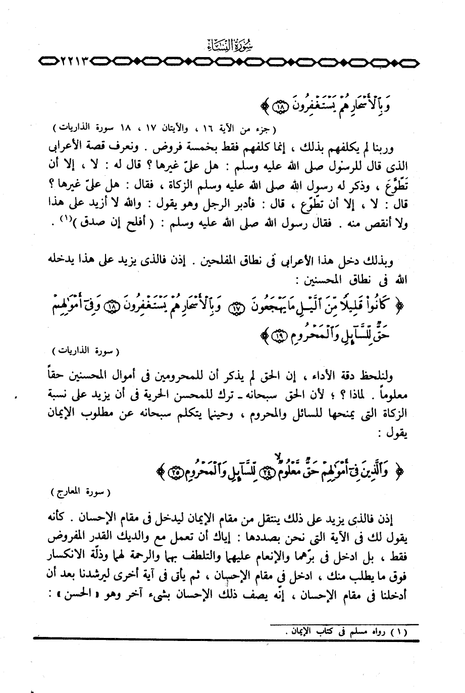 وبذلك دخل هذا الأعرابي في نطاق المفلحين. إذن فالذي يزيد على هذا يدخله الله في نطاق المحسنين. {كَانُواْ قَلِيلاً مِّن الليل مَا يَهْجَعُونَ وبالأسحار هُمْ يَسْتَغْفِرُونَ وفي أَمْوَالِهِمْ حَقٌّ لَّلسَّآئِلِ والمحروم} [الذاريات: 17 - 19] .