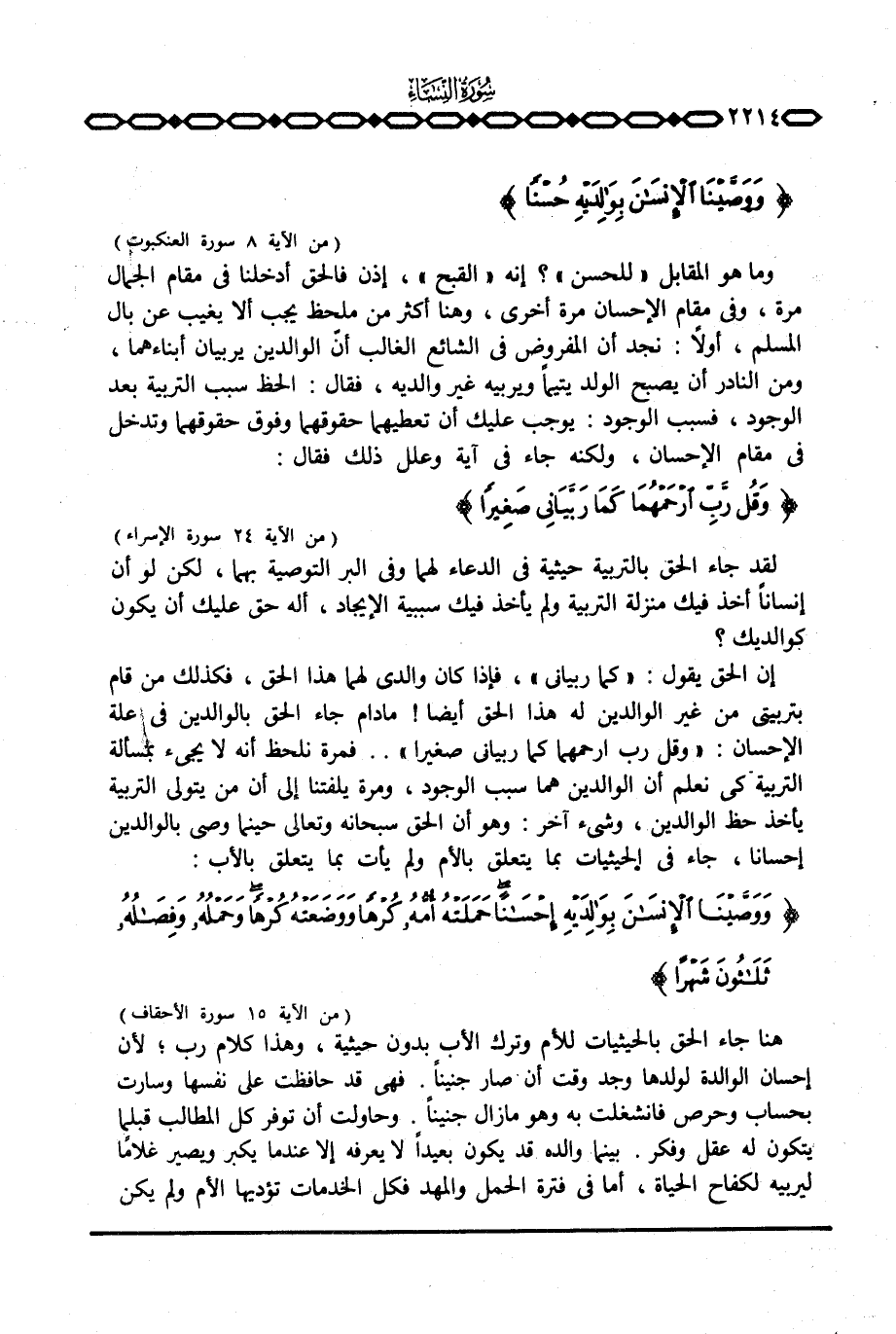 هنا جاء الحق بالحيثيات للأم وترك الأب بدون حيثية، وهذا كلام رب؛ لأن إحسان الوالدة لولدها وجد وقت أن صار جنيناً. فهي قد حافظت على نفسها وسارت بحساب وحرص فانشغلت به وهو مازال جنيناً. وحاولت أن توفر كل المطالب قبلما يتكون له عقل وفكر. بينما والده قد يكون بعيداً لا يعرفه إلا عندما يكبر ويصير غلاماً ليربيه لكفاح الحياة، أما في الحمل والمهد فكل الخدمات تؤديها الأم ولم يكن