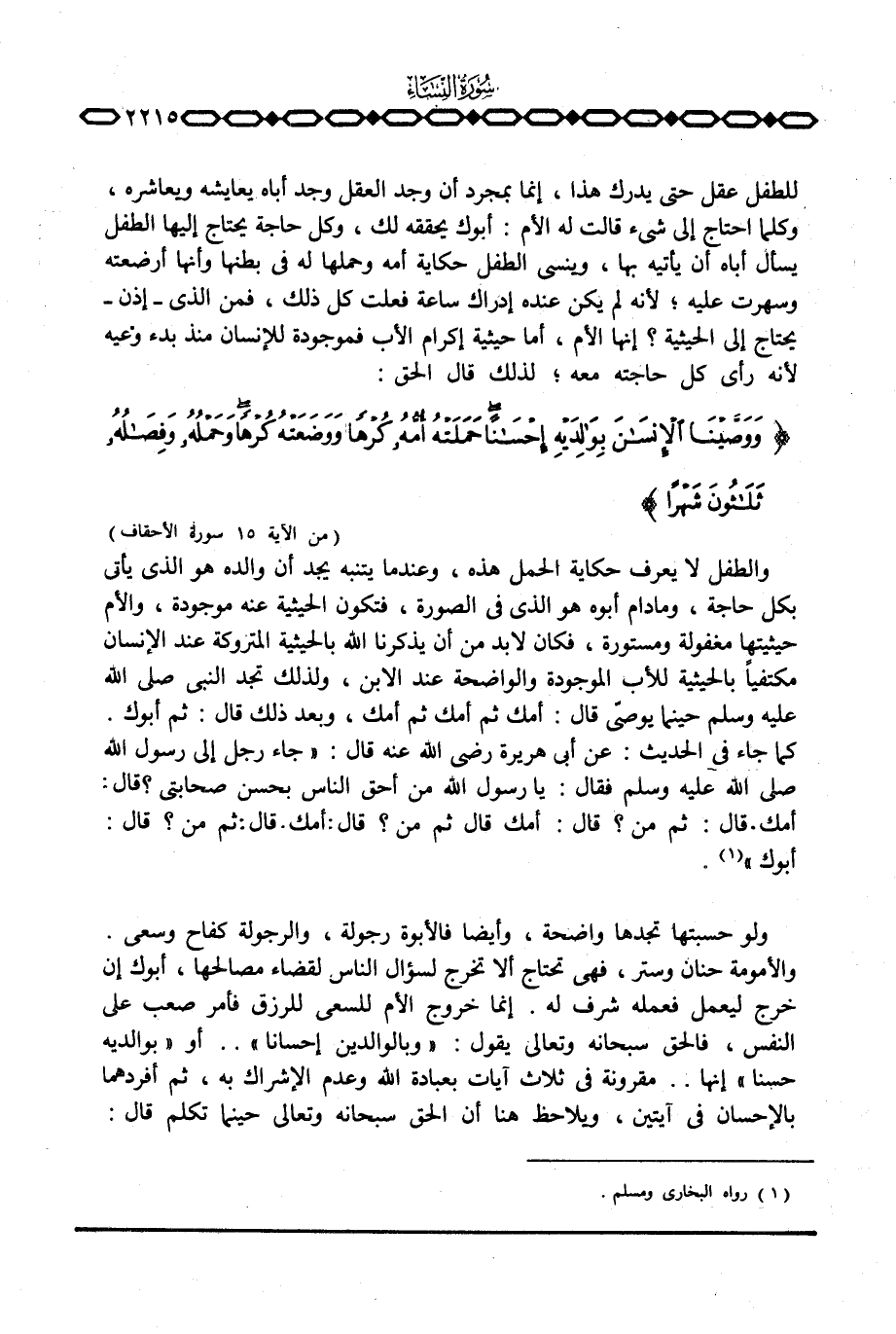 والطفل لا يعرف حكاية الحمل هذه، وعندما يتنبه يجد أن والده هو الذي يأتي بكل حاجة، وما دام أبوه هو الذي في الصورة، فتكون الحيثية عنه موجودة، والأم حيثيتها مغفولة ومستورة، فكان لا بد من أن يذكرنا الله بالحيثية المتروكة عند الإنسان مكتفياً بالحيثية للأب الموجودة والواضحة عند الابن، ولذلك تجد النبي صَلَّى اللَّهُ عَلَيْهِ وَسَلَّم َ حينما يوصيّ قال: أمك ثم أمك ثم أمك، وبعد ذلك قال: ثم أبوك.