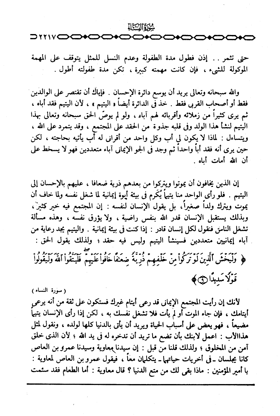 إن الذين يخافون أن يموتوا ويتركوا من بعدهم ذرية ضعافا، عليهم بالإحسان إلى اليتيم. فلو رأى الواحد منا يتيماً يُكَرم في بيئة إيوة إيمانية لما شغل نفسه ولما خاف أن يموت ويترك ولداً صغيراً، بل يقول الإنسان لنفسه: إن المجتمع فيه خير كثير، وبذلك يستقبل الإنسان قدر الله بنفس راضية، ولا يؤرق نفسه، وهذه مسألة تشغل الناس فنقول لكل إنسان قادر: إذا كنت في بيئة إيمانية. واليتيم يجد رعاية من آباء إيمانيين متعددين فسينشأ اليتيم وليس فيه حقد؛ ولذلك يقول الحق: {وَلْيَخْشَ الذين لَوْ تَرَكُواْ مِنْ خَلْفِهِمْ ذُرِّيَّةً ضِعَافاً خَافُواْ عَلَيْهِمْ فَلْيَتَّقُواّ الله وَلْيَقُولُواْ قَوْلاً سَدِيداً} [النساء: 9] .