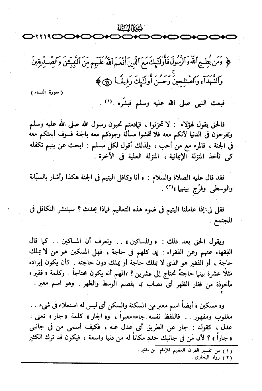 ويقول الحق بعد ذلك: «والمساكين» . . ونعرف أن المساكين. . كما قال الفقهاء عنهم وعن الفقراء: إن كلهم في حاجة، فهل المسكين هو من لا يملك حاجة، أو الفقير هو الذي لا يملك حاجة أو يملك دون حاجته. كأن يكون إيراده مثلاً عشرة بينما حاجتهُ تحتاج إلى عشرين؟ المهم أنه يكون محتاجاً. وكلمة «فقير» مأخوذة من فقار الظهر أي مصاب بما يقصم الوسط والظهر. وهو اسم معبر.