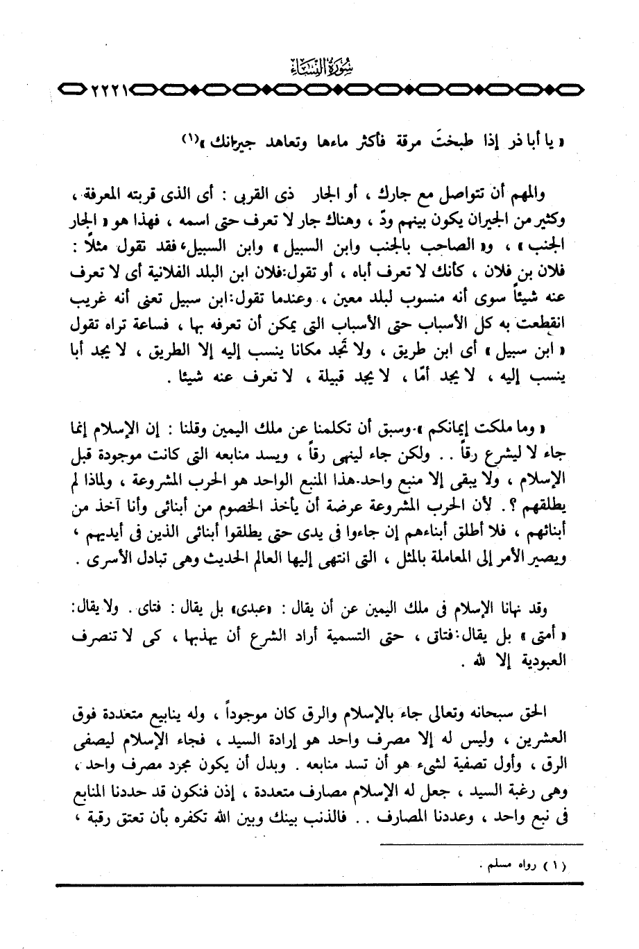 الحق سبحانه وتعالى جاء بالإسلام والرق كان موجوداً، وله ينابيع متعددة فوق العشرين، وليس له إلا مصرف واحد هو إرادة السيد، فجاء الإسلام ليصفي الرق، وأول تصفية لشيء هو أن تسد منابعه. وبدل أن يكون مجرد مصرف واحد، وهي رغبة السيد، جعل له الإسلام مصارف متعددة، إذن فنكون قد حددنا المنابع في نبع واحد، وعددنا المصارف. . فالذنب بينك وبين الله تكفره بأن تعتق رقبة،
