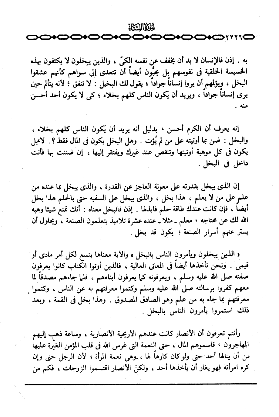 به. إذن فالإنسان لا بد أن يخفف عن نفسه الكيّ، والذين يبخلون لا يكتفون بهذه الخسيسة الخلقية في نفوسهم بل يحبُّون أيضاً أن تتعدى إلى سواهم كأنهم عشقوا البخل، ويؤلمهم أن يروا إنساناً جواداً؛ يقول لك البخيل: لا تنفق؛ لأنه يتألم حين يرى إنساناً جواداً، ويريد أن يَكون الناس كلهم بخلاء؛ كي لا يكون أحد أحسن منه.