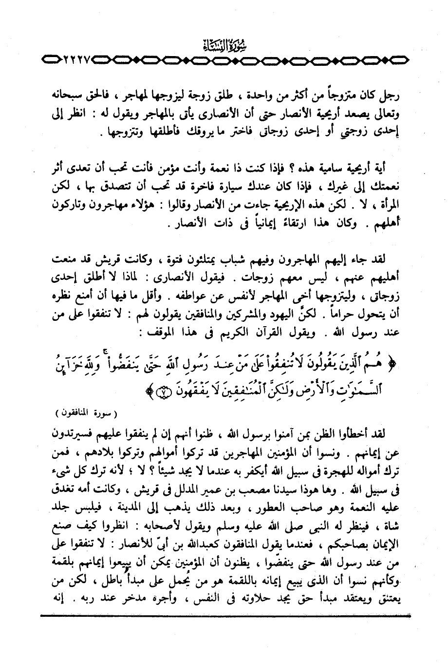 لقد جاء إليهم المهاجرون وفيهم شباب يمتلئون فتوة، وكانت قريش قد منعت أهليهم عنهم، ليس معهم زوجات. فيقول الأنصاري: لماذا لا أطلق إحدى زوجاتي، وليتزوجها أخي المهاجر لأنفس عن عواطفه. وأقل ما فيها أن أمنع نظره أن يتحول حراماً. لكنَّ اليهود والمشركين والمنافقين يقولون لهم: لا تنفقوا على من عند رسول الله. ويقول القرآن الكريم في هذا الموقف: