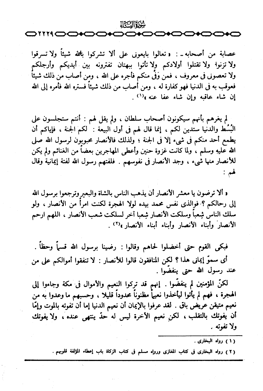 «ألا ترضون يا معشر الأنصار أن يذهب الناس بالشاة والبعير وترجعوا برسول الله إلى رحالكم» فوالذي نفس محمد بيده لولا الهجرة لكنت أمرأً من الأنصار، ولو سلك الناس شِعباً وسلكت الأنصار شِعباً آخر لسلكت شعب الأنصار، اللهم ارحم الأنصار وأبناء الأنصار وأبناء أبناء الأنصار «.