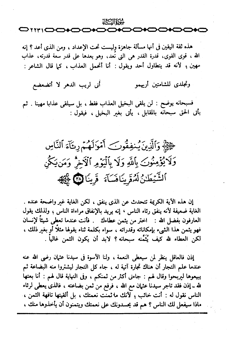 إن هذه الآية الكريمة تتحدث عن الذي ينفق، لكن الغاية غير واضحة عنده. الغاية ضعيفة لأنه ينفق رئاء الناس، إنه يريد بالإنفاق مراءاة الناس؛ ولذلك يقول العارفون بفضل الله: اختر من يثمن عطاءك. فأنت عندما تعطي شيئاً لإنسان فهو يثمن هذا الشيء بإمكاناته وقدراته، سواء بكلمة ثناء يقولها مثلاً أو بغير ذلك، لكن العطاء لله كيف يُثَمِّنه سبحانه؟ لا بد أن يكون الثمن غالياً.