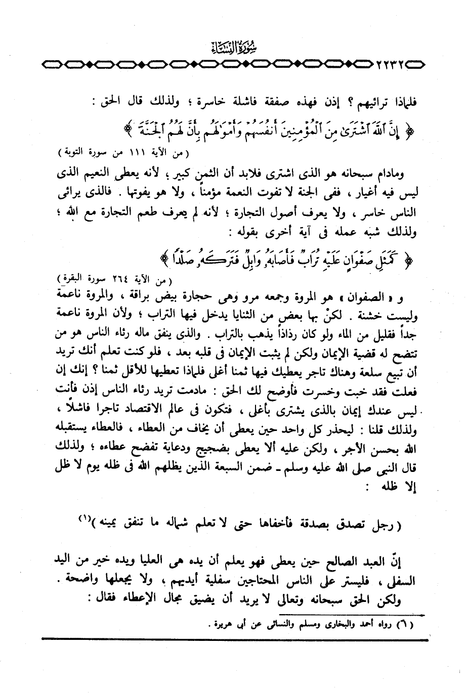 وما دام سبحانه هو الذي اشترى فلا بد أن الثمن كبير؛ لأنه يعطي النعيم الذي ليس فيه أغيار، ففي الجنة لا تفوت النعمة مؤمناً، ولا هو يفوتها. فالذي يرائي الناس خاسر، ولا يعرف أصول التجارة؛ لأنه لم يعرف طعم التجارة مع الله؛ ولذلك شبه عمله في آية أخرى بقوله: {كَمَثَلِ صَفْوَانٍ عَلَيْهِ تُرَابٌ فَأَصَابَهُ وَابِلٌ فَتَرَكَهُ صَلْداً} [البقرة: 264] .