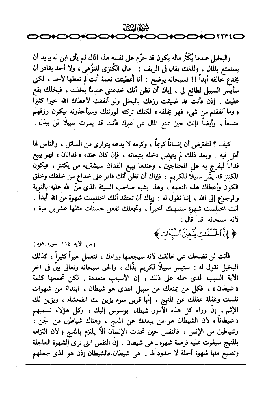 كيف؟ لنفترض أن إنساناً كريماً، وكرمه لا يدعه يتوارى من السائل، والناس لها أمل فيه. وبعد ذلك لم ينهض دخله بتبعاته، فإن كان عنده «فدانان» فهو يبيع فداناً ليفرج به على المحتاجين، وعندما يبيع الفدان سيشتريه من يكتنز، فيكون المكتنز قد يسَّر سبيلاً للكريم، فإياك أن تظن أنك قادر على خداع من خلقك وخلق الكون وأعطاك هذه النعمة، وهذا يشبه صاحب السيئة الذي منّ الله عليه بالتوبة والرجوع إلى الله، إننا نقول له: إياك أن نعتقد أنك اختلست شهوة من الله أبداً. أنت اختلست شهوة ستلهبك أخيراً، وتجعلك تفعل حسنات مثلها عشرين مرة، لأنه سبحانه قد قال: {إِنَّ الحسنات يُذْهِبْنَ السيئات} [هود: 114] .