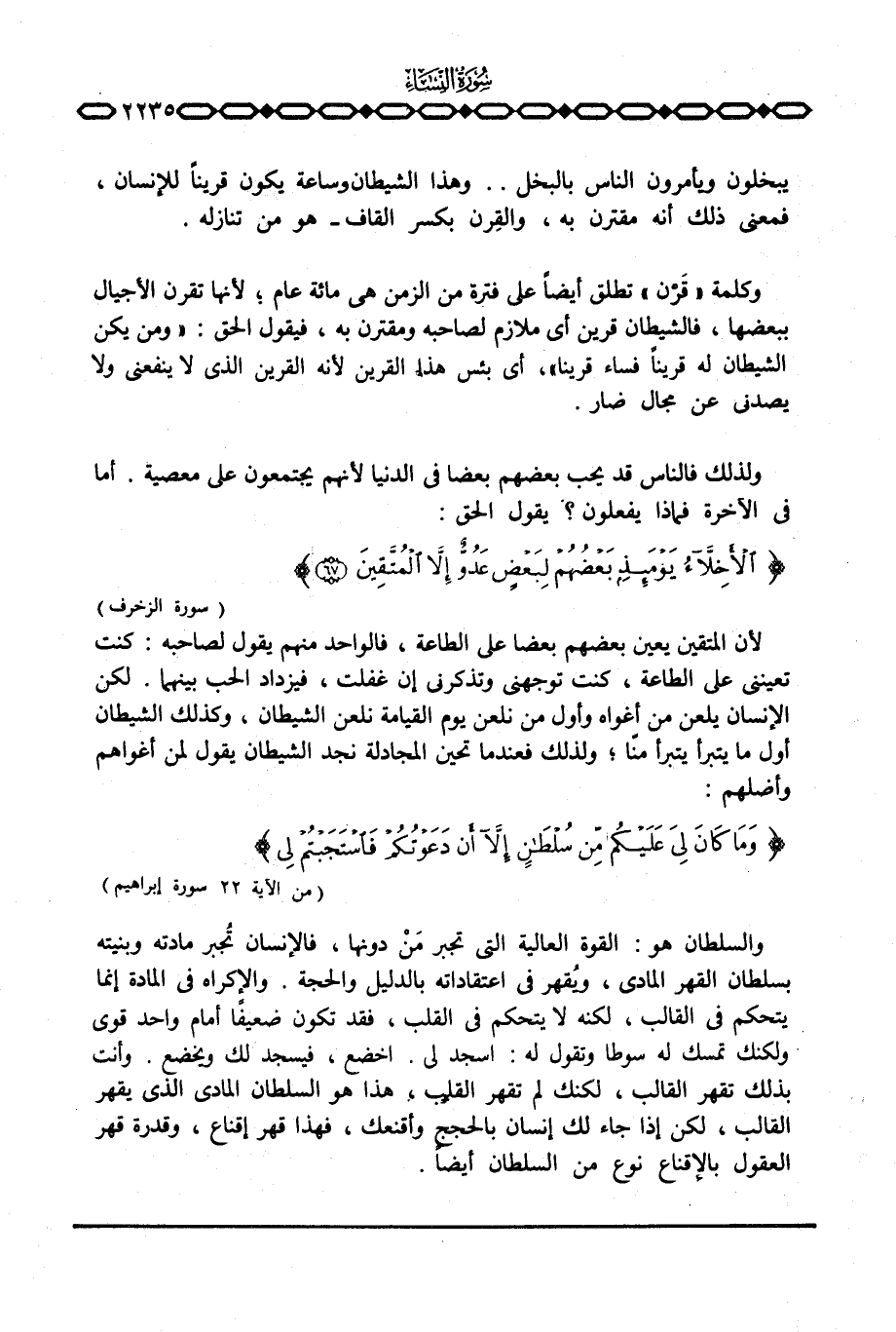 لأن المتقين يعين بعضهم بعضا على الطاعة، فالواحد منهم يقول لصاحبه: كنت تعينني على الطاعة، كنت توجهني وتذكرني إن غفلت، فيزداد الحب بينهما. لكن الإنسان يلعن من أغواه وأول من نلعن يوم القيامة نلعن الشيطان، وكذلك الشيطان أول ما يتبرأ يتبرأ منّا؛ ولذلك فعندما تحين المجادلة نجد الشيطان يقول لمن أغواهم وأضلهم: {وَمَا كَانَ لِيَ عَلَيْكُمْ مِّن سُلْطَانٍ إِلاَّ أَن دَعَوْتُكُمْ فاستجبتم لِي}