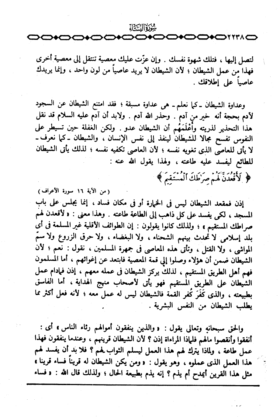 إذن فمقعد الشيطان ليس في الخمارة أو في مكان فساد، إنما يجلس على باب المسجد، لكي يفسد على كل ذاهب إلى الطاعة طاعته. وهذا معنى: {لأَقْعُدَنَّ لَهُمْ صِرَاطَكَ المستقيم} ؛ ولذلك كانوا يقولون: إن الطوائف الأقلية غير المسلمة في أي بلد إسلامي لا تحدث بينهم الشحناء، ولا البغضاء، ولا حرق الزروع ولا سمّ الشيطان ضمن أن هؤلاء وصلوا إلى قمة المعصية فابتعد عن إغوائهم، أما المسلمون فهم أهل الطريق المستقيم، لذلك يركز الشيطان في عمله معهم، إذن فما دام عمل الشيطان على الطريق المستقيم فهو يأتي لأصحاب منهج الهداية، أما الفاسق بطبيعته، والذي كَفَرَ كُفر القمة فالشيطان ليس له عمل معه؛ لأنه فعل أكثر مما يطلب الشيطان من النفس البشرية.