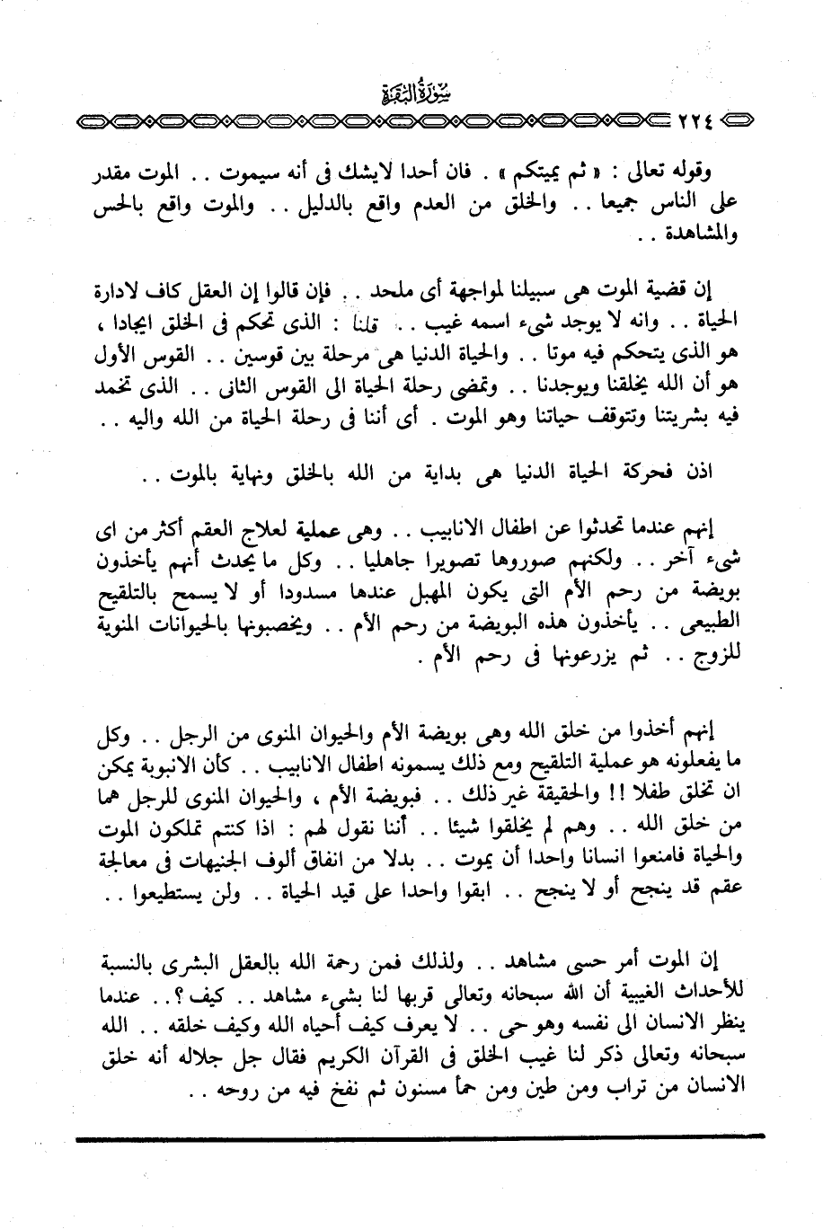 إنهم أخذوا من خلق الله وهي بويضة الأم والحيوان المنوي من الرجل. . وكل ما يفعلونه هو عملية التلقيح ومع ذلك يسمونه أطفال الأنابيب. . كأن الأنبوبة يمكن أن تخلق طفلا!! والحقيقة غير ذلك. . فبويضة الأم، والحيوان المنوي للرجل هما من خلق الله. . وهم لم يخلقوا شيئا. . أننا نقول لهم: إذا كنتم تملكون الموت والحياة فامنعوا إنسانا واحدا أن يموت. . بدلا من إنفاق ألوف الجنيهات في معالجة عقم قد ينجح أو لا ينجح. . ابقوا واحدا على قيد الحياة. . ولن يستطيعوا. .