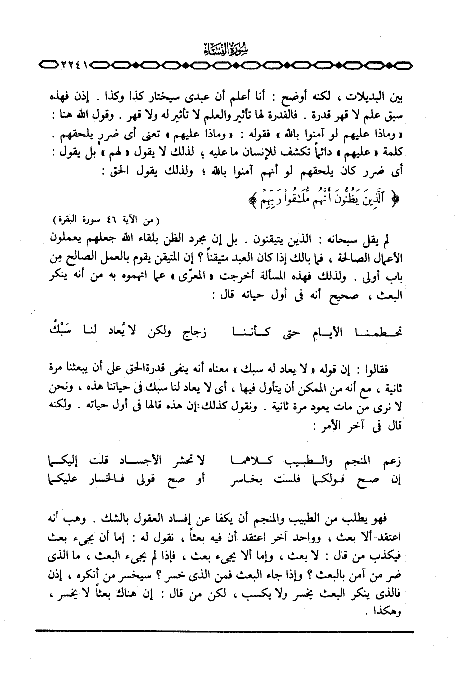 لم يقل سبحانه: الذين يتيقنون. بل إن مجرد الظن بلقاء الله جعلهم يعملون الأعمال الصالحة، فما بالك إذا كان العبد متيقناً؟ إن المتيقن يقوم بالعمل الصالح من باب أولى. ولذلك فهذه المسألة أخرجت «المعرّي» عما أتهموه به من أنه ينكر البعث، صحيح أنه في أول حياته قال:
