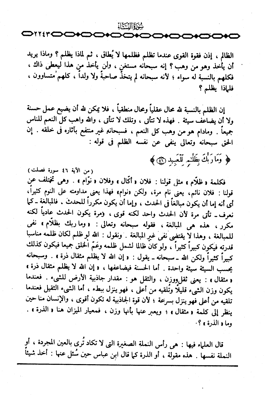 إن الظلم بالنسبة لله محال عقلياً ومحال منطقياً، فلا يمكن لله أن يضيع عمل حسنة ولا أن يضاعف سيئة. فهذه لا تتأتى، وتلك لا تتأتى، والله واهب كل النعم للناس جميعاً. وما دام هو من وهب كل النعم، فسبحانه غير منتفع بآثاره في خلقه. إن الحق سبحانه وتعالى ينفي عن نفسه الظلم في قوله: {وَمَا رَبُّكَ بِظَلاَّمٍ لِّلْعَبِيدِ} [فصلت: 46] .