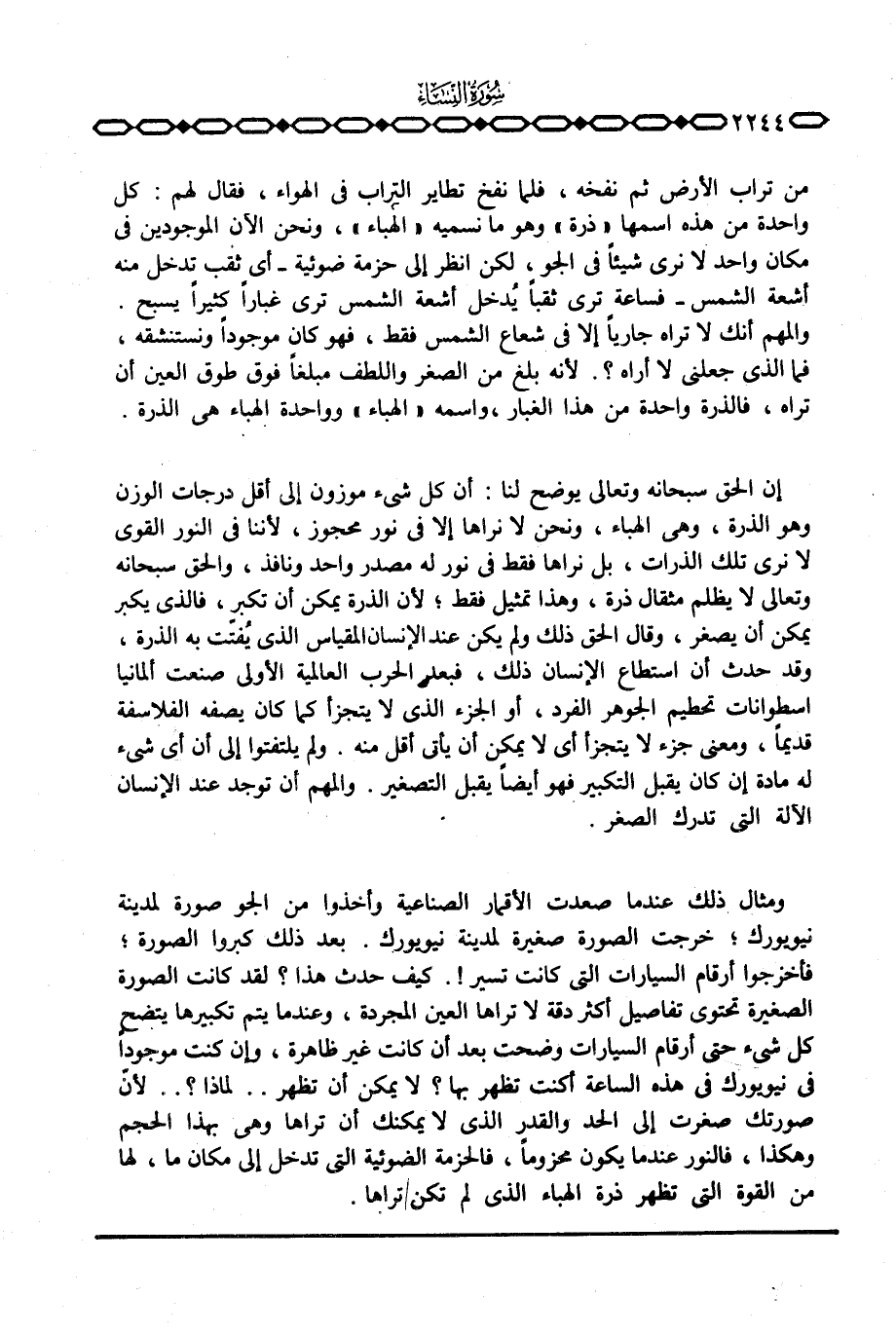 إن الحق سبحانه وتعالى يوضح لنا: أن كل شيء موزون إلى أقل درجات الوزن وهو الذرة، وهي الهباء، ونحن لا نراها إلا في نور محجوز، لأننا في النور القوي لا نرى تلك الذرات، بل نراها فقط في نور له مصدر واحد ونافذ، والحق سبحانه وتعالى لا يظلم مثقال ذرة، وهذا تمثيل فقط؛ لأن الذرة يمكن أن تكبر، فالذي يكبر يمكن أن يصغر، وقال الحق ذلك ولم يكن عند الإنسان المقياس الذي يُفتّت به الذرة، وقد حدث أن استطاع الإنسان ذلك، فبعد الحرب العالمية الأولى صنعت ألمانيا اسطوانات تحطيم الجوهر الفرد، أو الجزء الذي لا يتجزأ كما كان يصفه الفلاسفة قديماً، ومعنى جزء لا يتجزأ أي لا يمكن أن يأتي أقل منه. ولم يلتفتوا إلى أن أي شيء له مادة إن كان يقبل التكبير فهو أيضاً يقبل التصغير. والمهم أن توجد عند الإنسان الآلة التي تدرك الصغر.