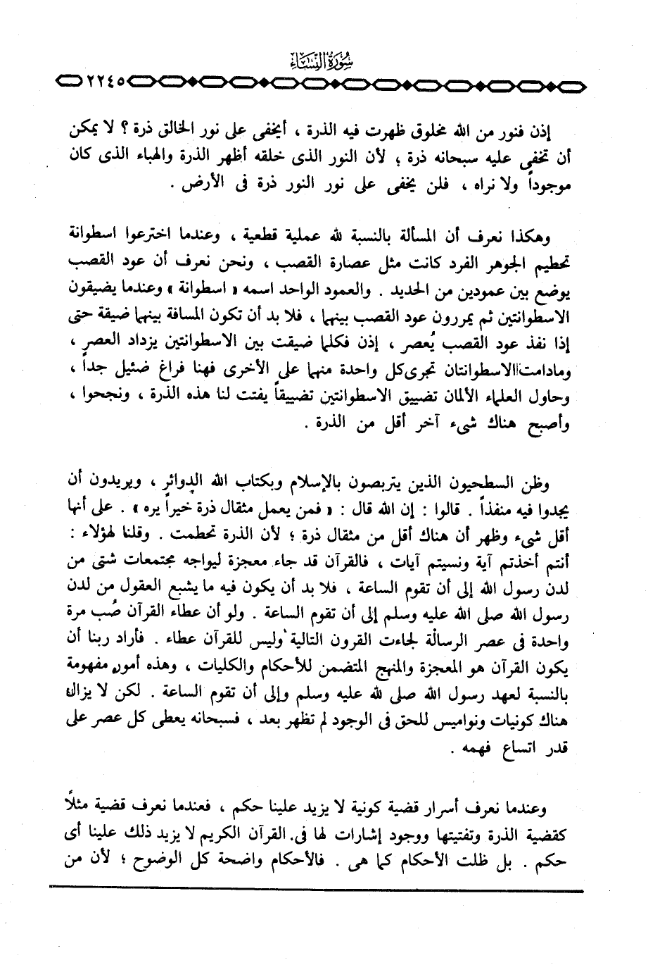 وظن السطحيون الذين يتربصون بالإسلام وبكتاب الله الدوائر، ويريدون أن يجدوا فيه منفذاً. قالوا: إن الله قال: {فَمَن يَعْمَلْ مِثْقَالَ ذَرَّةٍ خَيْراً يَرَهُ} . على أنها أقل شيء وظهر أن هناك أقل من مثقال ذرة؛ لأن الذرة تحطمت. وقلنا لهؤلاء: أنتم أخذتم آية ونسيتم آيات، فالقرآن قد جاء معجزة ليواجه مجتمعات شتى من لدن رسول الله إلى أن تقوم الساعة، فلا بد أن يكون فيه ما يشبع العقول من لدن رسول الله صَلَّى اللَّهُ عَلَيْهِ وَسَلَّم َ إلى أن تقوم الساعة. ولو أن عطاء القرآن صُب مرة واحدة في عصر الرسالة لجاءت القرون التالية وليس للقرآن عطاء. فأراد ربنا أن يكون القرآن هو المعجزة والمنهج المتضمن للأحكام والكليات، وهذه أمور مفهومة بالنسبة لعهد رسول الله صَلَّى اللَّهُ عَلَيْهِ وَسَلَّم َ وإلى أن تقوم الساعة. لكن لا يزال هناك كونيات ونواميس للحق في الوجود لم تظهر بعد، فسبحانه يعطي كل عصر على قدر اتساع فهمه.