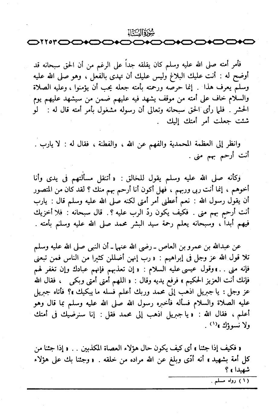 عن عبد الله بن عمرو بن العاص - رَضِيَ اللَّهُ عَنْهما - أن النبي صَلَّى اللَّهُ عَلَيْهِ وَسَلَّم َ تلا قول الله عَزَّ وَجَلَّ في إبراهيم: «رب إنهن أضللن كثيرا من الناس فمن تبعني فإنه مني. .» وقول عيسى عليه السلام: «إن تعذبهم فإنهم عبادك وإن تغفر لهم فإنك أنت العزيز الحكيم» فرفع يديه وقال: «اللهم أمتي أمتي وبكى، فقال الله عَزَّ وَجَلَّ: يا جبريل اذهب إلى محمد وربك أعلم فسله ما يبكيك؟ فأتاه جبريل عَلَيْهِ الصَّلَاة وَالسَّلَام ُ فسأله فأخبره رسول الله صَلَّى اللَّهُ عَلَيْهِ وَسَلَّم َ بما قال وهو أعلم، فقال الله:» يا جبريل اذهب إلى محمد فقل: إنا سنرضيك في أمتك ولا نسوؤك «.