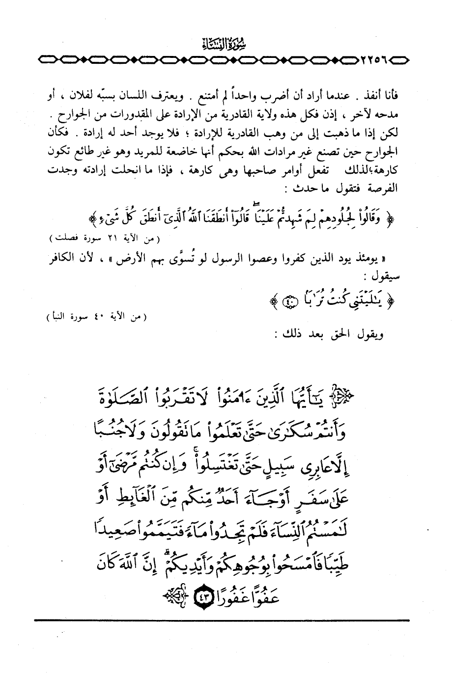 فأنا أنفذ. عندما أراد أن أضرب واحداً لم أمتنع. ويعترف اللسان بسبّه لفلان، أو مدحه لآخر، إذن فكل هذه ولاية القادرية من الإرادة على المقدورات من الجوارح. لكن إذا ما ذهبت إلى من وهب القادرية للإرادة؛ فلا يوجد أحد له إرادة. فكأن الجوارح حين تصنع غير مرادات اللله بحكم أنها خاضعة للمريد وهو غير طائع تكون كارهة؛ لذلك تفعل أوامر صاحبها وهي كارهة، فإذا ما انحلت إرادته وجدت الفرصة فتقول ما حدث: {وَقَالُواْ لِجُلُودِهِمْ لِمَ شَهِدتُّمْ عَلَيْنَا قالوا أَنطَقَنَا الله الذي أَنطَقَ كُلَّ شَيْءٍ} [فصلت: 21] .