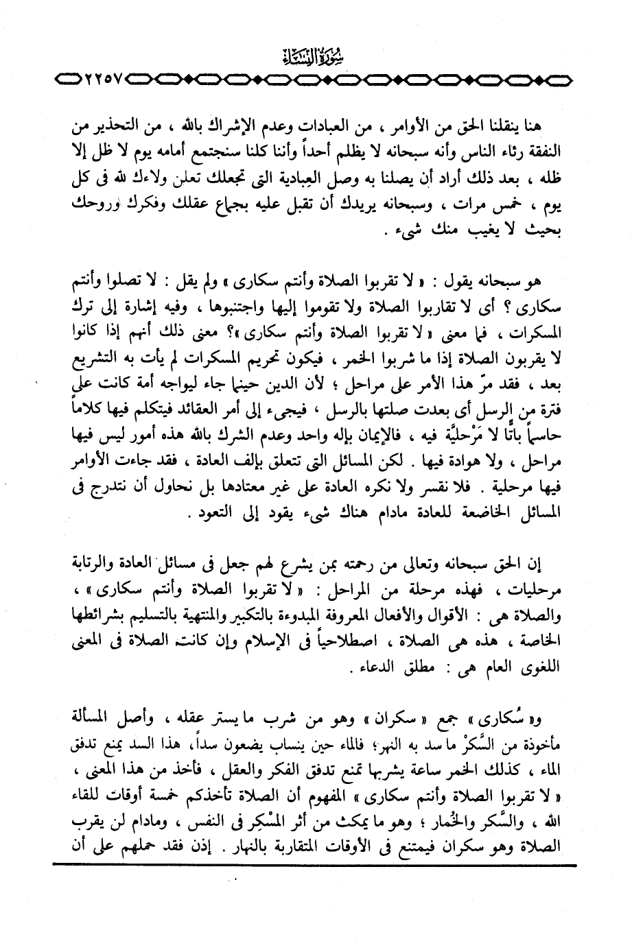 هو سبحانه يقول: {لاَ تَقْرَبُواْ الصلاة وَأَنْتُمْ سكارى} ولم يقل: لا تصلوا وأنتم سكارى؟ أي لا تقاربوا الصلاة ولا تقوموا إليها واجتنبوها، وفيه إشارة إلى ترك المسكرات، فما معنى {لاَ تَقْرَبُواْ الصلاة وَأَنْتُمْ سكارى} ؟ معنى ذلك أنهم إذا كانوا لا يقربون الصلاة إذا ما شربوا الخمر، فيكون تحريم المسكرات لم يأت به التشريع بعد، فقد مرّ هذا الأمر على مراحل؛ لأن الدين حينما جاء ليواجه أمة كانت على فترة من الرسل أي بعدت صلتها بالرسل، فيجيء إلى أمر العقائد فيتكلم فيها كلاماً حاسماً باتّاً لا مَرْحليَّة فيه، فالإيمان بإله واحد وعدم الشرك بالله هذه أمور ليس فيها مراحل، ولا هوادة فيها. لكن المسائل التي تتعلق بإلف العادة، فقد جاءت الأوامر فيها مرحلية. فلا نقسر ولا نكره العادة على غير معتادها بل نحاول أن نتدرج في المسائل الخاضعة للعادة ما دام هناك شيء يقود إلى التعود.