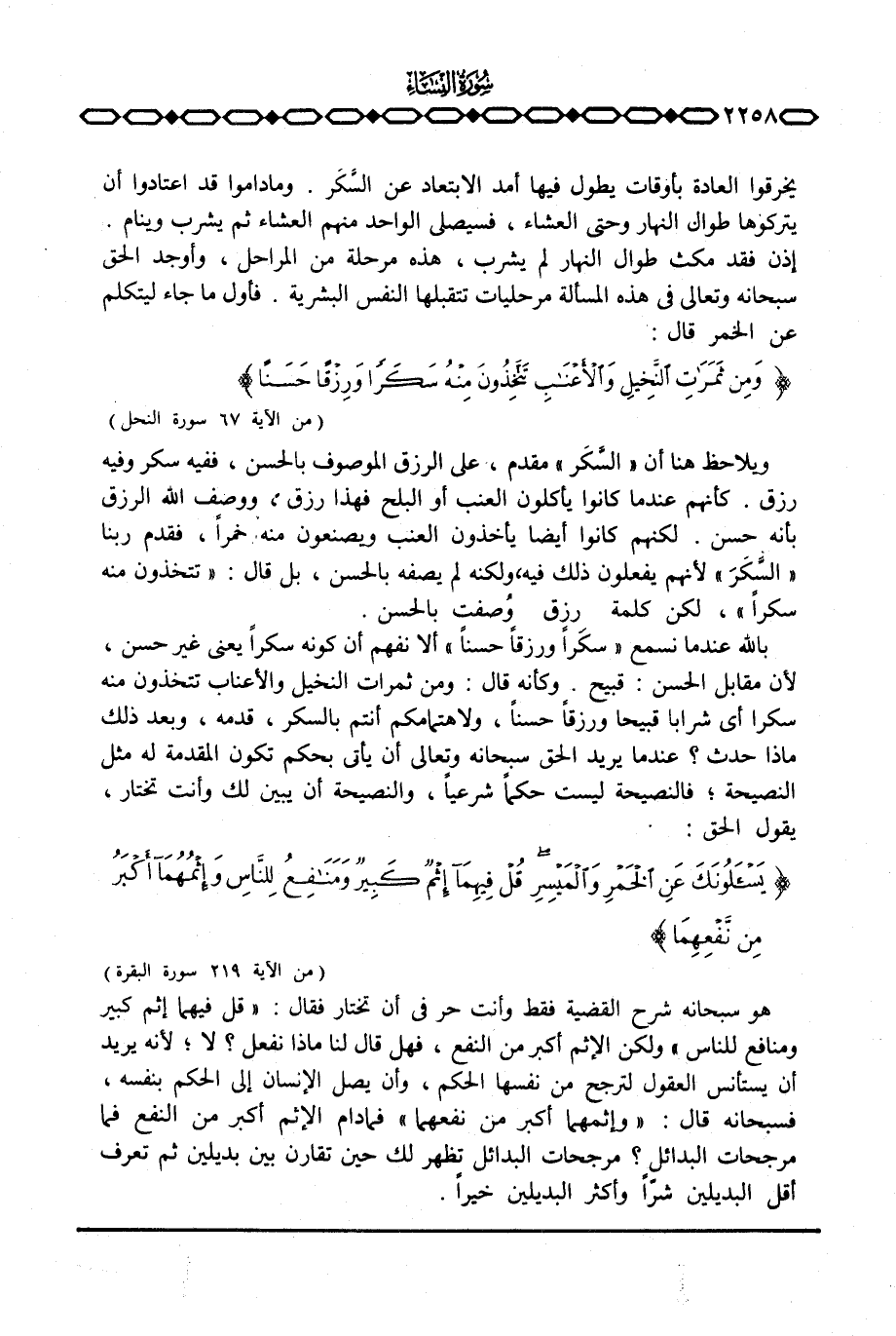 بالله عندما نسمع {سَكَراً وَرِزْقاً حَسَناً} ألا نفهم أن كونه سكراً يعني غير حسن، لأن مقابل الحسن: قبيح. وكأنه قال: ومن ثمرات النخيل والأعناب تتخذون منه سكرا أي شرابا قبيحا ورزقاً حسناً، ولاهتمامكم أنتم بالسكر، قدمه، وبعد ذلك ماذا حدث؟ عندما يريد الحق سبحانه وتعالى أن يأتي بحكم تكون المقدمة له مثل النصيحة؛ فالنصيحة ليست حكماً شرعياً، والنصيحة أن يبين لك وأنت تختار، يقول الحق: {يَسْأَلُونَكَ عَنِ الخمر والميسر قُلْ فِيهِمَآ إِثْمٌ كَبِيرٌ وَمَنَافِعُ لِلنَّاسِ وَإِثْمُهُمَآ أَكْبَرُ مِن نَّفْعِهِمَا} [البقرة: 219] .