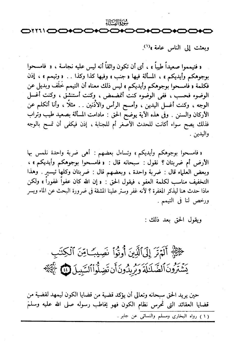 {فَتَيَمَّمُواْ صَعِيداً طَيِّباً} ، أي أن تكون واثقاً أنه ليس عليه نجاسة، {فامسحوا بِوُجُوهِكُمْ وَأَيْدِيكُمْ} ، المسألة فيها «جنب» وفيها كذا وكذا. . «وتيمم» ، إذن فكلمة {فامسحوا بِوُجُوهِكُمْ وَأَيْدِيكُمْ} ليس ذلك معناه أن التيمم خَلَف وبديل عن الوضوء فحسب، ففي الوضوء كنت أتمضمض، وكنت أستنشق، وكنت أغسل الوجه، وكنت أغسل اليدين، وأمسح الرأس والأذنين. . مثلاً، وأنا أتكلم عن الأركان والسنن. وفي هذه الآية يوضح الحق: ما دامت المسألة بصعيد طيب وتراب فذلك يصح سواء أكانت للحدث الأصغر أم للجنابة، إذن فيكفي أن تمسح بالوجه واليدين.