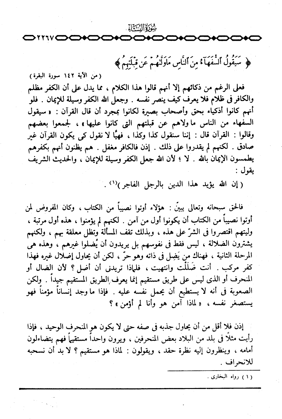 فعلى الرغم من ذكائهم إلا أنهم قالوا هذا الكلام، مما يدل على أن الكفر مظلم والكافر في ظلام فلا يعرف كيف ينصر نفسه. وجعل الله الكفر وسيلة للإيمان. فلو أنهم كانوا أذكياء بحق أصحاب بصيرة لكانوا بمجرد أن قال القرآن: {سَيَقُولُ السفهآء مِنَ الناس مَا وَلاَّهُمْ عَن قِبْلَتِهِمُ التي كَانُواْ عَلَيْهَا} ، لجمعوا بعضهم وقالوا: القرآن قال: إننا سنقول كذا وكذا، فهيَّا لا نقول كي يكون القرآن غير صادق. لكنهم لم يقدروا على ذلك. إذن فالكافر مغفل. هم يظنون أنهم بكفرهم يطمسون الإيمان بالله. لا؛ لأن الله جعل الكفر وسيلة للإيمان، والحديث الشريف يقول: