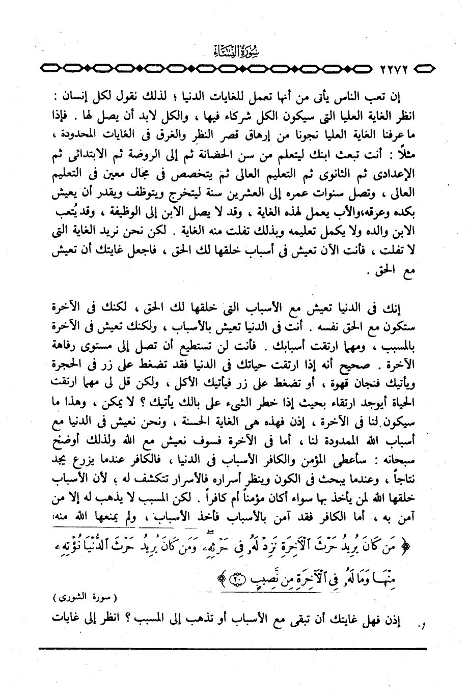 إنك في الدنيا تعيش مع الأسباب التي خلقها لك الحق، لكنك في الآخرة ستكون مع الحق نفسه. أنت في الدنيا تعيش بالأسباب، ولكنك تعيش في الآخرة بالمسبب، ومهما ارتقت أسبابك. فأنت لن تستطيع أن تصل إلى مستوى رفاهة الآخرة. صحيح أنه إذا ارتقت حياتك في الدنيا فقد تضغط على زر في الحجرة ويأتيك فنجان قهوة، أو تضغط على زر فيأتيك الأكل، ولكن قل لي مهما ارتقت الحياة أيوجد بحيث إذا خطر الشيء على بالك يأتيك؟ لا يمكن، وهذا ما سيكون لنا في الآخرة، إذن فهذه هي الغاية الحسنة، ونحن نعيش في الدنيا مع أسباب الله الممدودة لنا، أما في الآخرة فسوف نعيش مع الله ولذلك أوضح سبحانه: سأعطي المؤمن والكافر الأسباب في الدنيا، فالكافر عندما يزرع يجد نتاجاً، وعندما يبحث في الكون وينظر أسراره فالأسرار تتكشف له؛ لأن الأسباب خلقها الله لمن يأخذ بها سواء أكان مؤمناً أم كافراً. لكن المسبب لا يذهب له إلا من آمن به، أما الكافر فقد آمن بالأسباب فأخذ الأسباب، ولم يمنعها الله منه: {مَن كَانَ يُرِيدُ حَرْثَ الآخرة نَزِدْ لَهُ فِي حَرْثِهِ وَمَن كَانَ يُرِيدُ حَرْثَ الدنيا نُؤْتِهِ مِنْهَا وَمَا لَهُ فِي الآخرة مِن نَّصِيبٍ} [الشورى: 20] .
