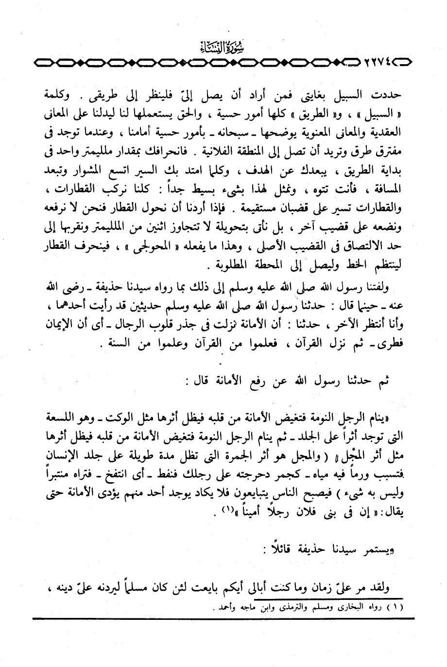 ولفتنا رسول الله صَلَّى اللَّهُ عَلَيْهِ وَسَلَّم َ إلى ذلك بما رواه سيدنا حذيفة - رَضِيَ اللَّهُ عَنْه - حينما قال: حدثنا رسول الله صَلَّى اللَّهُ عَلَيْهِ وَسَلَّم َ حديثين قد رأيت أحدهما، وأنا أنتظر الآخر، حدثنا: أن الأمانة نزلت في جذر قلوب الرجال - أي أن الإيمان فطري - ثم نزل القرآن، فعلموا من القرآن وعلموا من السنة.