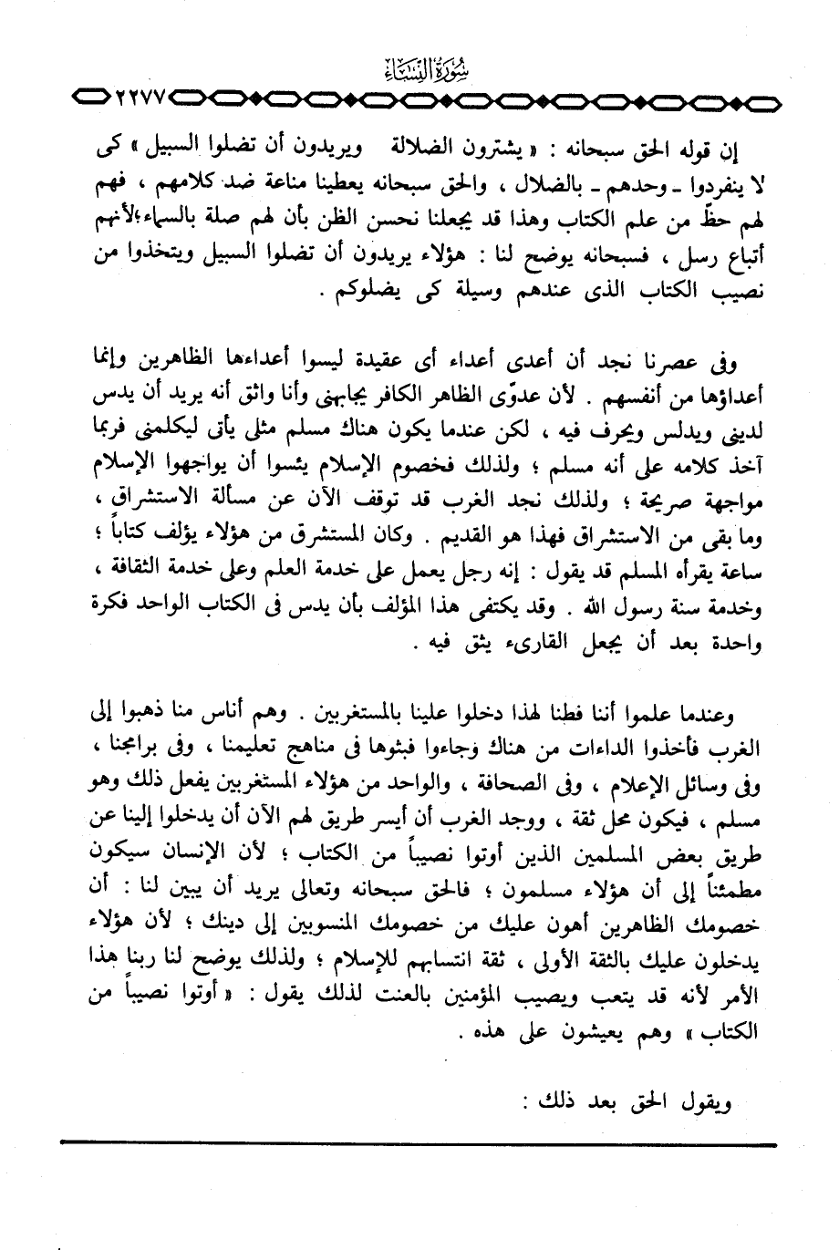 وفي عصرنا نجد أن أعدى أعداء أي عقيدة ليسوا أعداءها الظاهرين وإنما أعداؤها من أنفسهم. لأن عدوّي الظاهر الكافر يجابهني وأنا واثق أنه يريد أن يدس لديني ويدلس ويحرف فيه، لكن عندما يكون هناك مسلم مثلي يأتي ليكلمني فربما آخذ كلامه على أنه مسلم؛ ولذلك فخصوم الإسلام يئسوا أن يواجهوا الإسلام مواجهة صريحة؛ ولذلك نجد الغرب قد توقف الآن عن مسألة الاستشراق، وما بقي من الاستشراق فهذا هو القديم. وكان المستشرق من هؤلاء يؤلف كتاباً؛ ساعة يقرأه المسلم قد يقول: إنه رجل يعمل على خدمة العلم وعلى خدمة الثقافة، وخدمة سنة رسول الله. وقد يكتفي هذا المؤلف بأن يدس في الكتاب الواحد فكرة واحدة بعد أن يجعل القارئ يثق فيه.