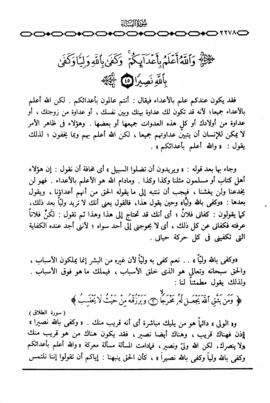 و «الولي» دائماً هو من يليك مباشرة أي أنه قريب منك. {وكفى بالله نَصِيراً} إذن فهناك قريب، وهناك أيضاً نصير، فقد يكون هناك من هو قريب منك ولا ينصرك، لكن الله وليّ ونصير، فما دامت المسألة مسألة معركة {والله أَعْلَمُ بِأَعْدَائِكُمْ وكفى بالله وَلِيّاً وكفى بالله نَصِيراً} ، كأن الحق ينبهنا: إياكم أن تقولوا إننا نلتمس