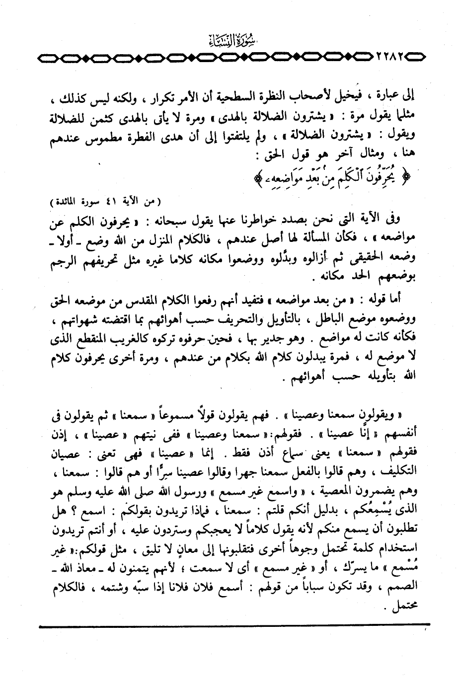 إلى عبارة، فيخيل لأصحاب النظر السطحية أن الأمر تكرار، ولكنه ليس كذلك، مثلما يقول مرة: {يشترون الضلالة بالهدى} ومرة لا يأتي بالهدى كثمن للضلالة ويقول: {يَشْتَرُونَ الضلالة} ، ولم يلتفتوا إلى أن هدى الفطرة مطموس عندهم هنا، ومثال آخر هو قول الحق: {يُحَرِّفُونَ الكلم مِن بَعْدِ مَوَاضِعِهِ} [المائدة: 41] .