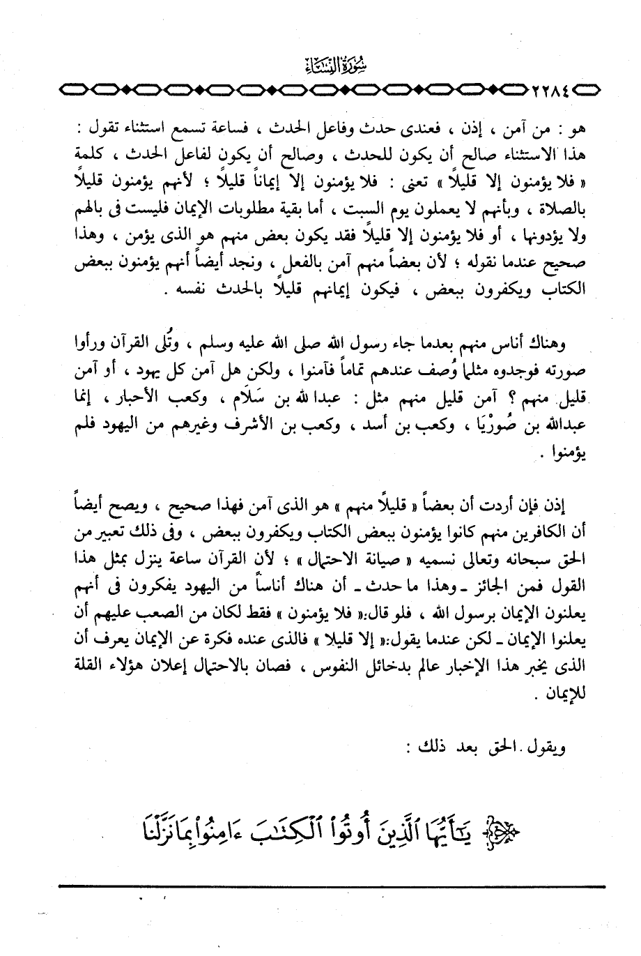 إذن فإن أردت أن بعضاً «قليلاً منهم» هو الذي آمن فهذا صحيح، ويصح أيضاً أن الكافرين منهم كانوا يؤمنون ببعض الكتاب ويكفرون ببعض، وفي ذلك تعبير من الحق سبحانه وتعالى نسميه «صيانة الاحتمال» ؛ لأن القرآن ساعة ينزل بمثل هذا القول فمن الجائز - وهذا ما حدث - أن هناك أناساً من اليهود يفكرون في أنهم يعلنون الإيمان برسول الله، فلو قال: «فلا يؤمنون» فقد لكان من الصعب عليهم أن يعلنون الإيمان - لكن عندما يقول: «إلا قليلاً» فالذي عنده فكرة عن الإيمان يعرف أن الذي يخبر هذا الإخبار عالم بدخائل النفوس، فصان بالاحتمال إعلان هؤلاء القلة للإيمان.